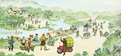 画作根据明慧网二零一五年五月二十日文章《村民都晓得“法轮大法好”》绘制。文章记述了十几名法轮功学员出钱出力,在十多年中义务为村民修路的故事。这条路使原本的“孤岛村”不再是孤岛,使偏僻闭塞的小村呈现一派欣欣向荣的景象。乡亲看着新修的大道就说:“都像炼法轮功的这社会就好了,再选村长我们就选炼法轮功的。”