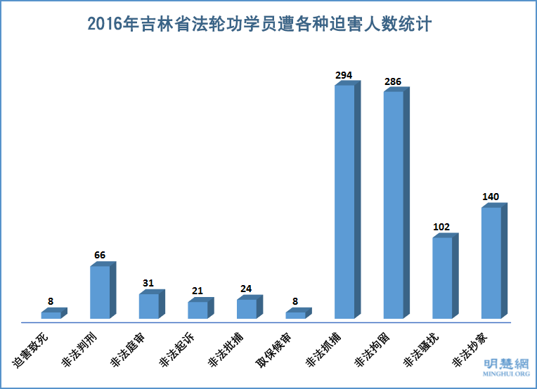 在2016年,吉林省293名法轮功学员被非法抓捕、强制洗脑及超期关押;286名法轮功学员被非法行政拘留及刑事拘留;31名法轮功学员被非法庭审;22名法轮功学员被非法起诉;24名法轮功学员被非法批捕;8名法轮功学员取保候审;102名法轮功学员被骚扰。