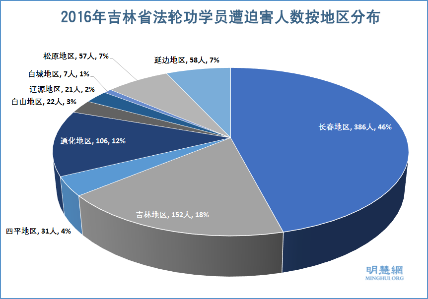 根据明慧网2016年曝光的迫害案例所做的不完全统计,2016年吉林省法轮功学员依然经受着不同程度的迫害,迫害面涉及9个地区42个市、县,至少有840名法轮功学员受到精神和肉体上的摧残。
