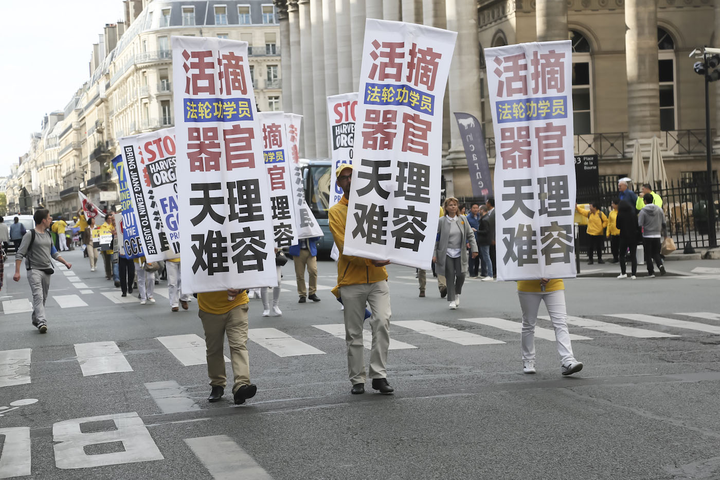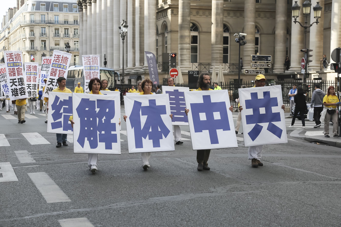 【明慧网二零一七年十月一日】(明慧记者德祥、德龙法国巴黎报道)二零一七年九月三十日下午五点,来自欧洲三十一个国家一千三百余名法轮功学员聚集在法国首都巴黎市中心 Place de la Bourse广场,拉开了大游行的序幕,游行队伍中包括《天国乐团》、腰鼓队、舞龙队、仙女队和功法表演,展现了法轮大法的美好。同时游行呼吁人们共同制止中共对法轮功长达十八年的迫害,包括手持被中共迫害致死的法轮功学员照片的队伍、揭露中共活体摘取法轮功学员器官的方阵以及退出中共。