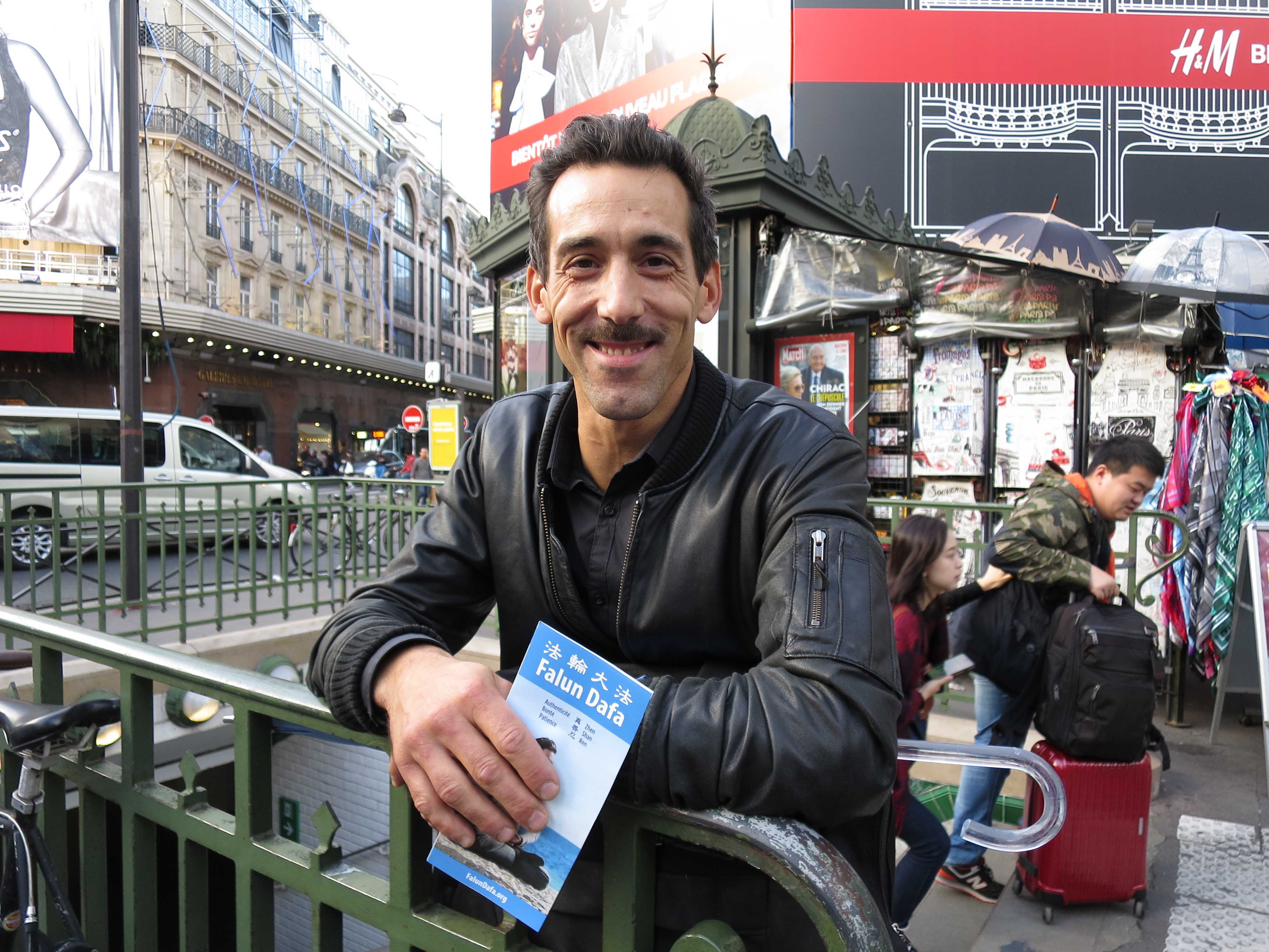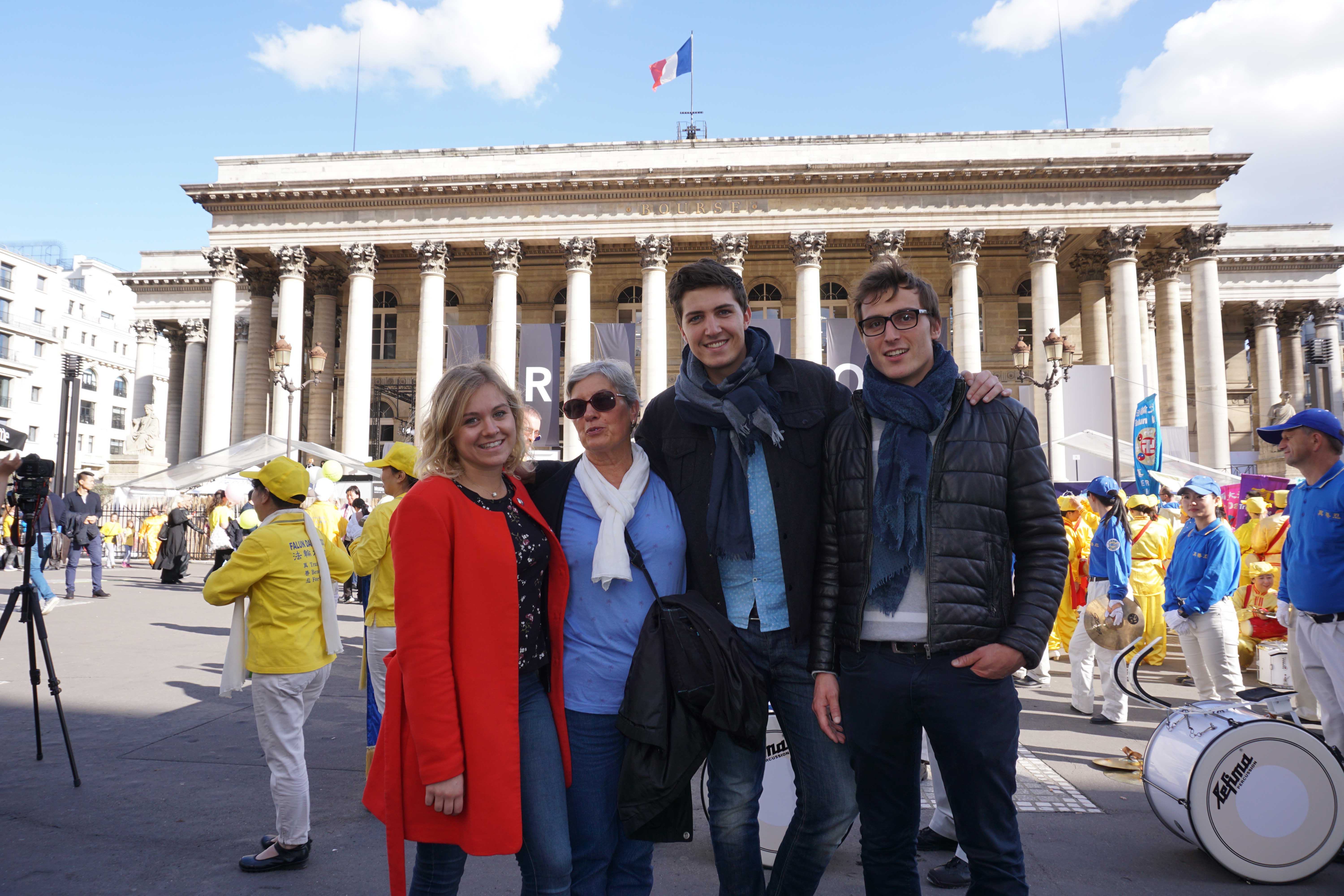 François Barrieu 是业余摄影师,游行出发的交易所广场上他在拍摄法轮功学员的集会和接下来的游行,他表示“游行很好看,很平和,而且天气也很 好。”Barrieu先生很认同法轮功学员信仰的真、善、忍,他觉得“这都是很好的价值,人们会减少紧张、减少急躁,会活的更长,给国家社会保险减轻负担,所以说到底这些都会让人受益。”对于中共迫害法轮功学员这件事,他认为:“一定要在世界各地揭露这些问题,(中共的迫害)是不对的。”