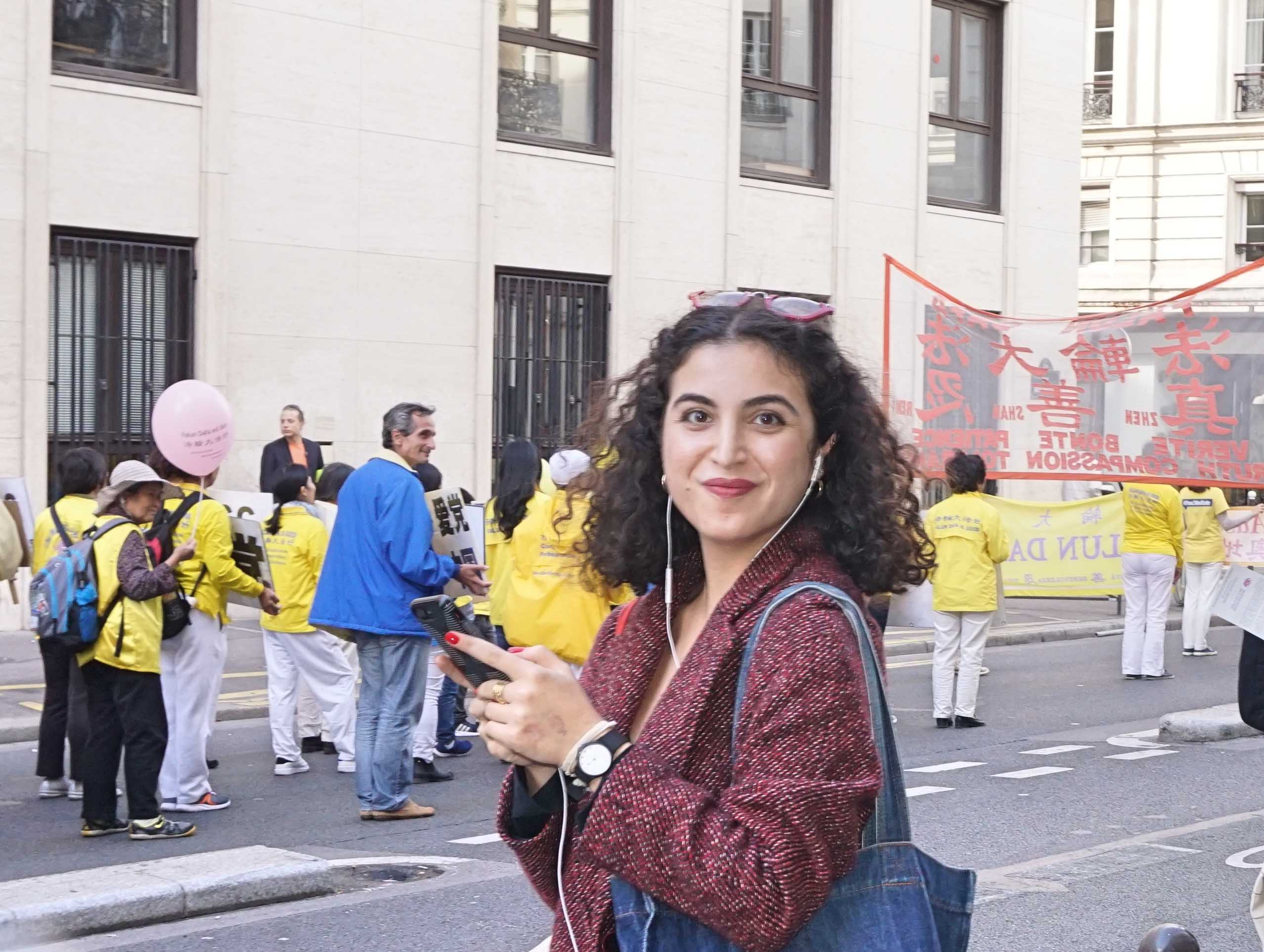 雕塑家Joëlle Lionne说:“我很吃惊因为对这件事一无所知。游行的人们看来很友善,他们都在微笑。坚信他们的信仰,这促使他们前进。真、善、忍是很好的价值,谁都应该这么想。”