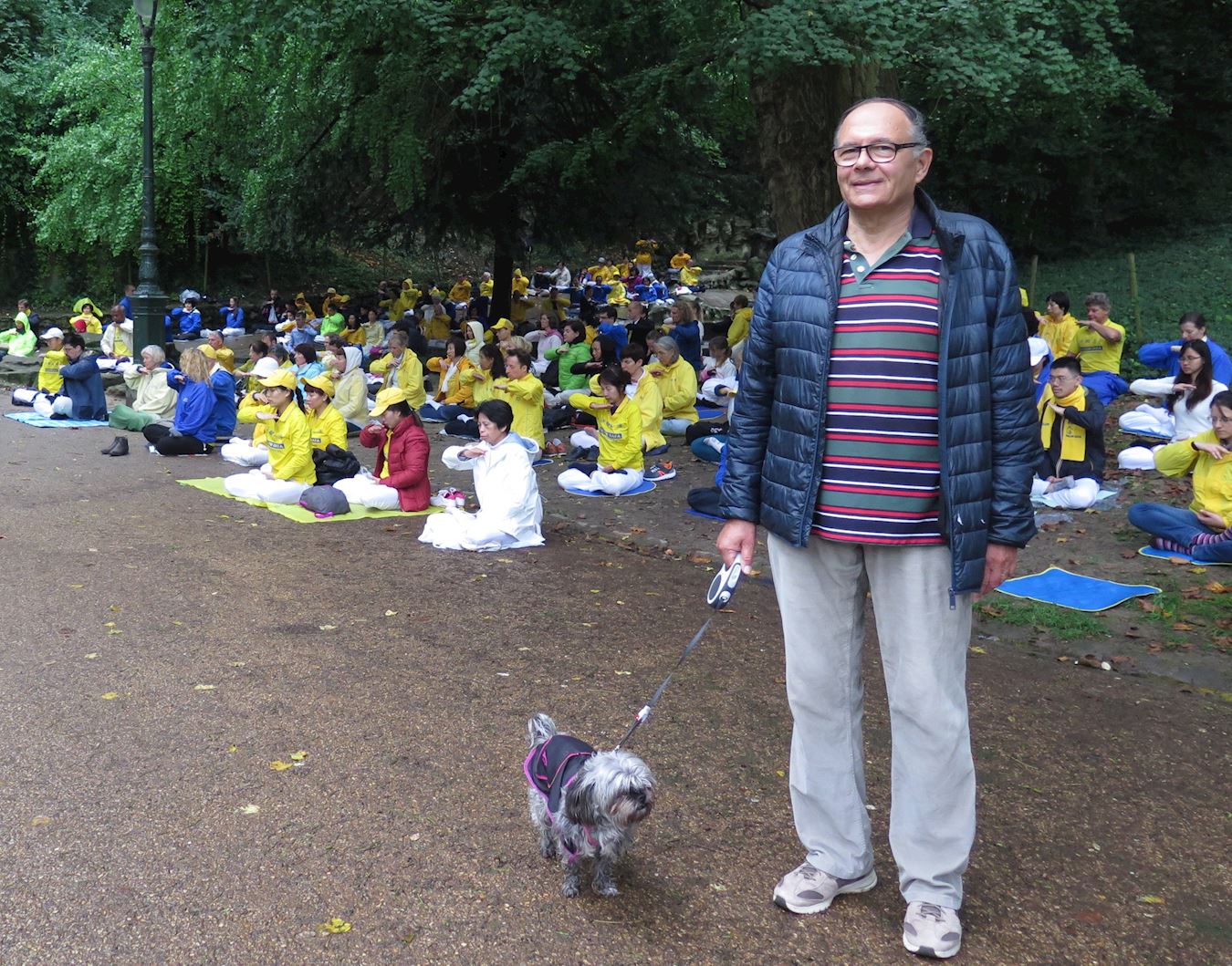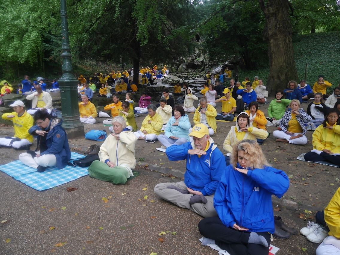 祥和的炼功场面吸引了在这里晨练和散步的民众的瞩目。爱德华(Edouard)先生是一位从法国农业及渔业部退休的官员,他熟知公园的山水草木和人文景致,每天三到四次在这个拿破仑三世后期建造的公园散步。当天上午,他发现在河岸边多了与往日不同的景致,在公园瀑布边几颗巨大梧桐树下的草坪上有几百个人随着舒缓和祥的音乐在安静地打坐,这些人闭着双目,脸上带着祥和的神情。和着音乐和树上的鸟鸣,他们犹如置身于世外。他们中有老人,也有儿童,有欧洲族裔的,也有黑发黄皮肤的,有西装革履的,也有身着休闲服的。
