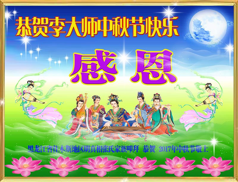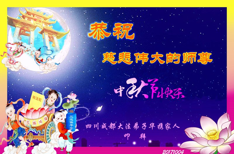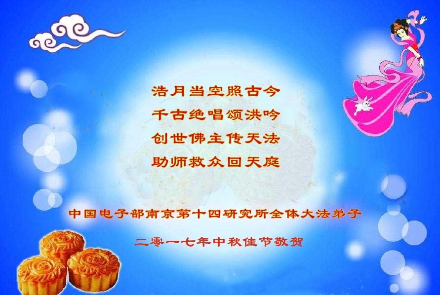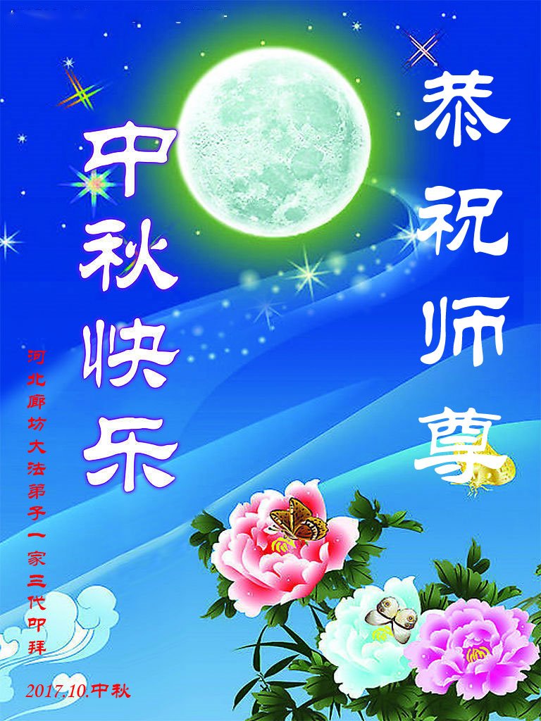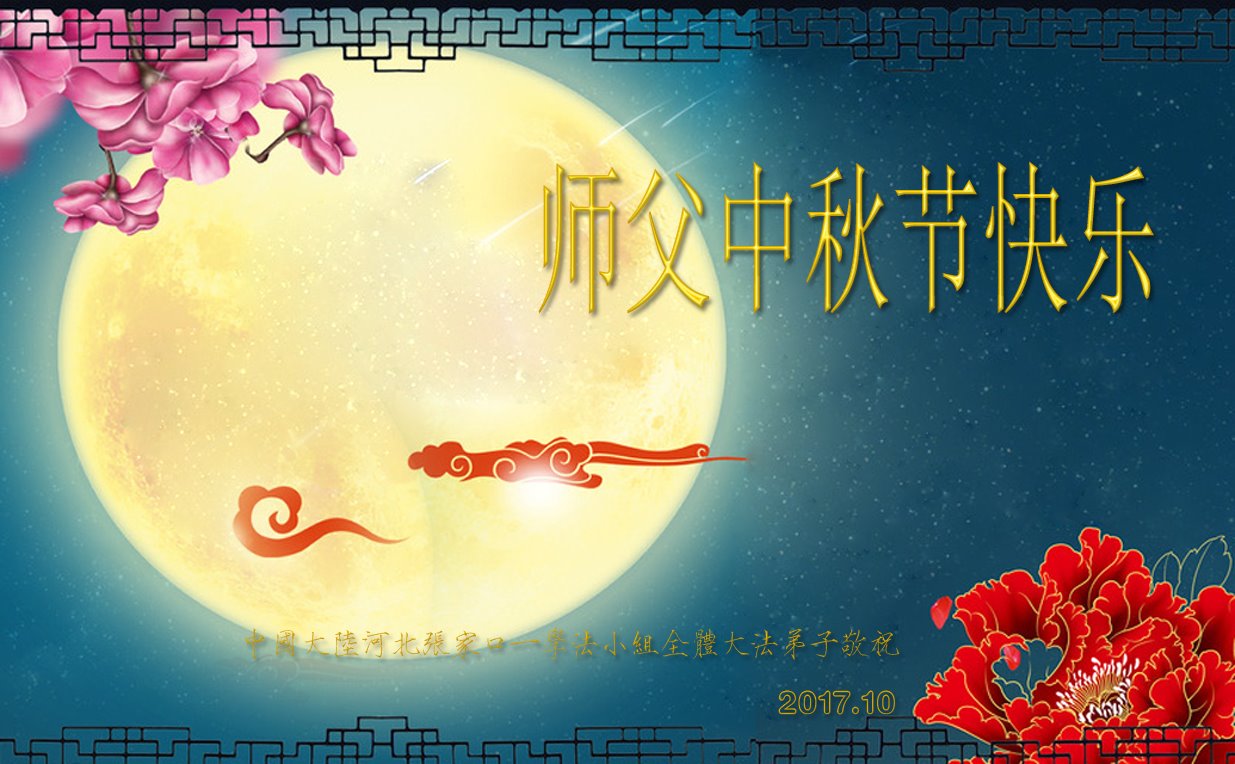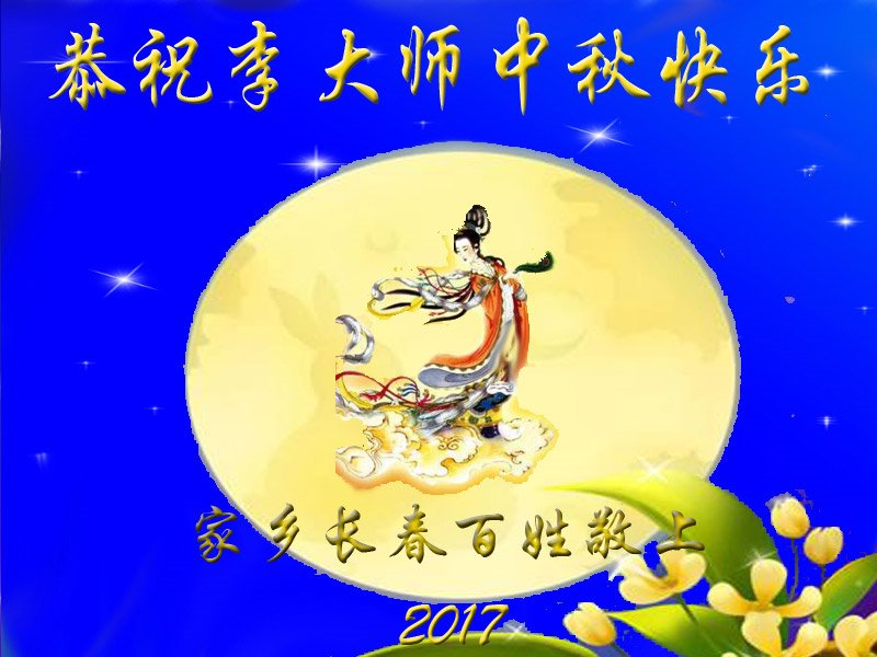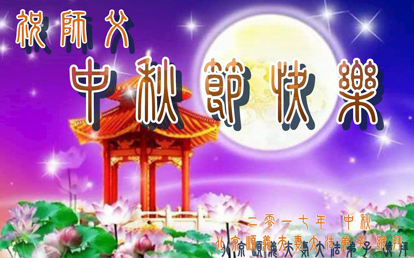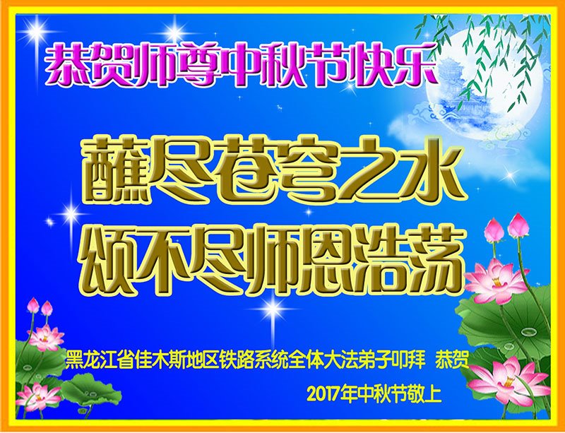 【明慧网二零一七年十月一日】浩月当空照古今,千古绝唱颂师恩!──来自中国大陆各行业,包括银行、财税、司法、航空航天、教育、各大油田、卫星测控、建设、铁路、电子研究、审计、卫生、纺织、电力、医疗、文艺、音乐、商业、外贸、农林、畜牧、水利、出版发行、邮政、矿产、石化、交通、供销、保险、军工、行政等系统的大法弟子遥祝师尊中秋快乐!