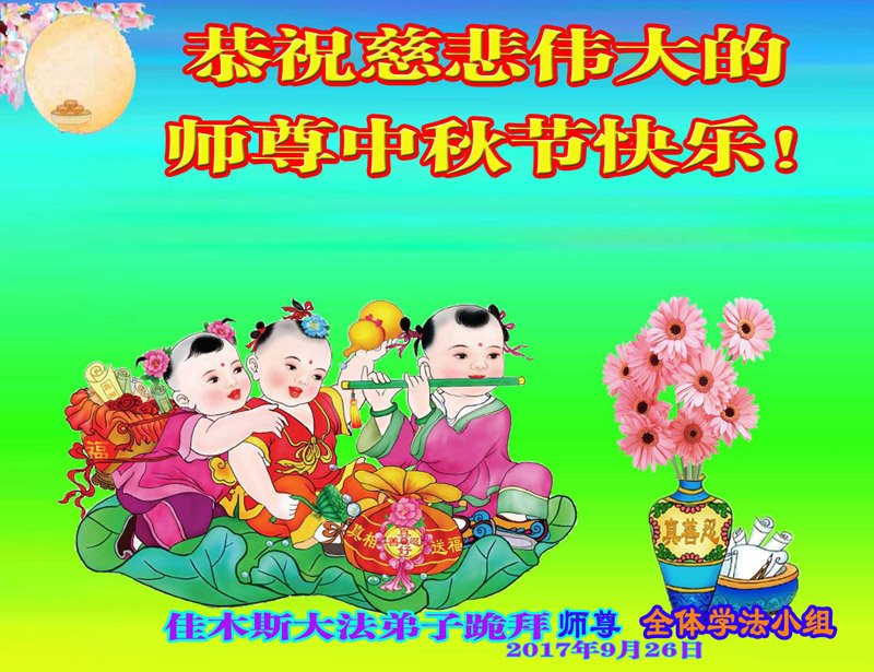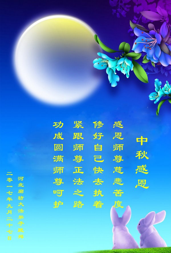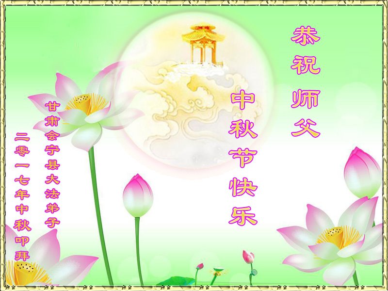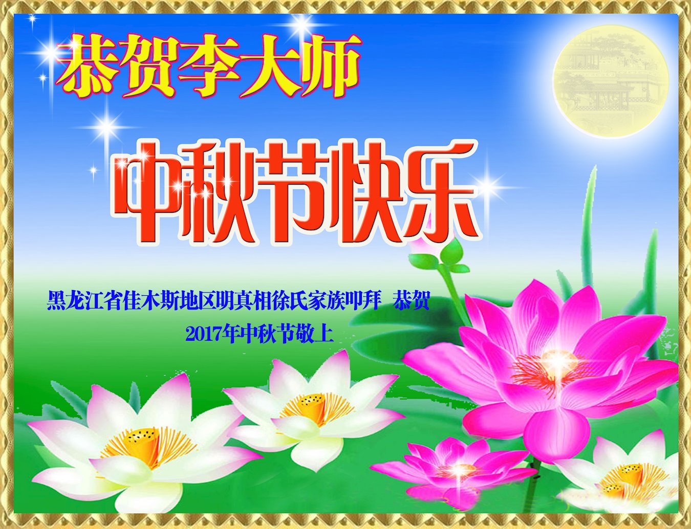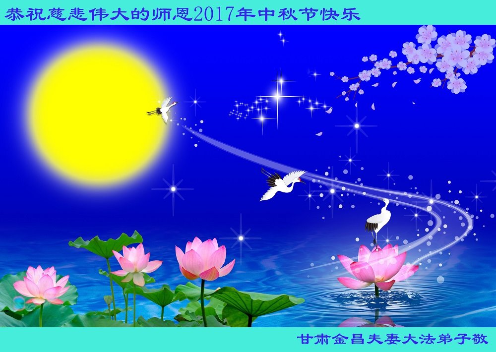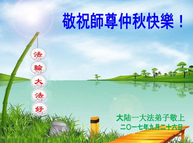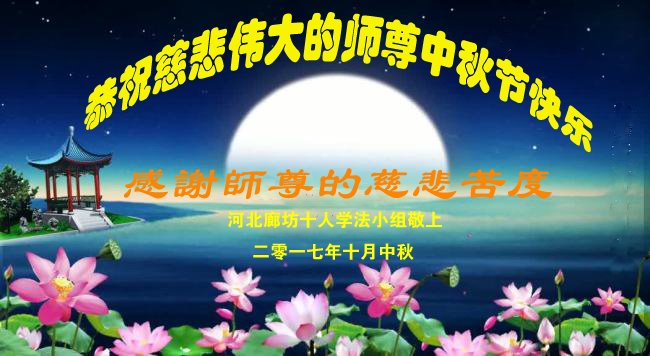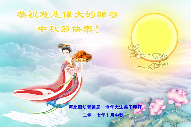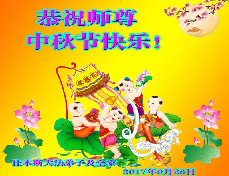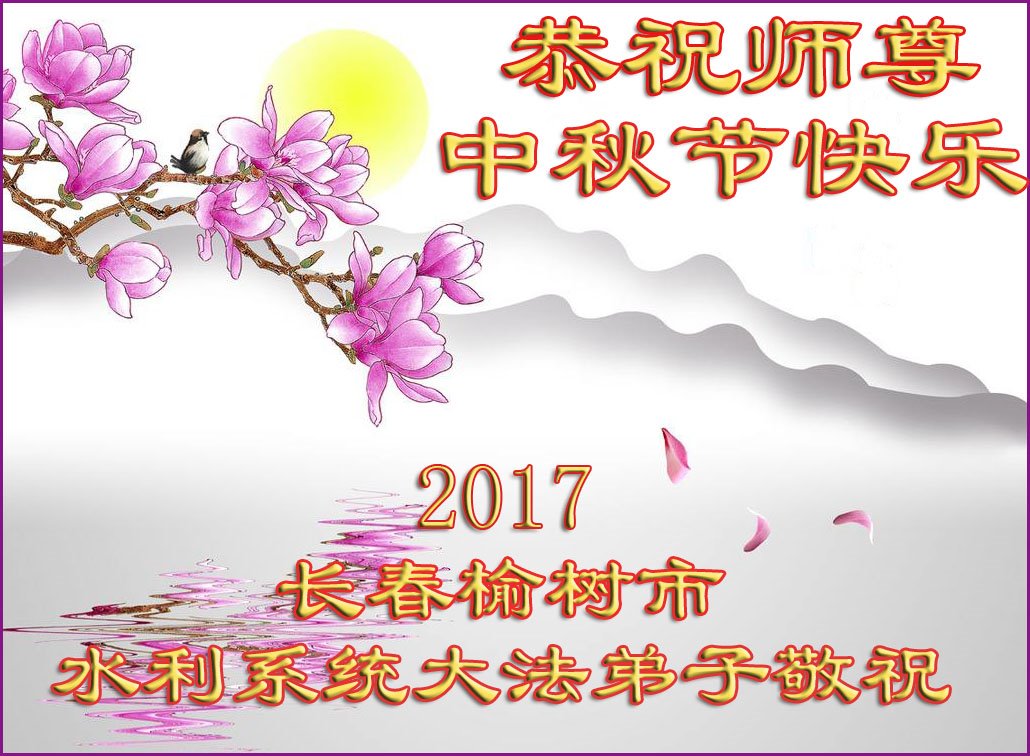 【明慧网二零一七年十月一日】浩月当空照古今,千古绝唱颂师恩!──来自中国大陆各行业,包括银行、财税、司法、航空航天、教育、各大油田、卫星测控、建设、铁路、电子研究、审计、卫生、纺织、电力、医疗、文艺、音乐、商业、外贸、农林、畜牧、水利、出版发行、邮政、矿产、石化、交通、供销、保险、军工、行政等系统的大法弟子遥祝师尊中秋快乐!