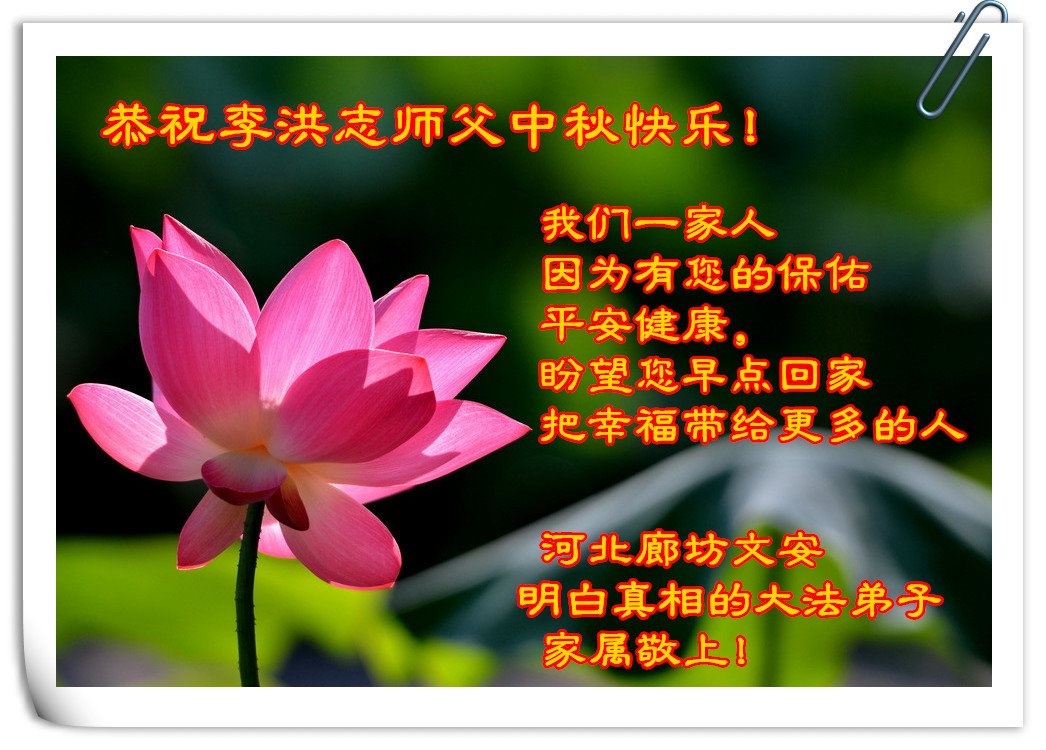 李大师您好,您辛苦了。我借中秋节到来之际,谢谢慈悲伟大的大法师父,您是众生的希望,作为有良知的中国人,支持大法与大法弟子所做的一切,“法轮大法好”、“真善忍好”会永远铭刻在我的心中。愿您早日回大陆,众生想您!叩拜李大师。