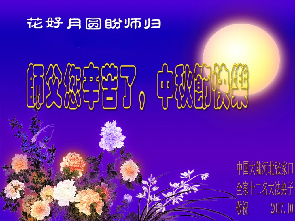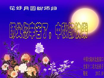 一七年的中秋节即将到来,在中国大陆传统的团圆节日里,弟子们更加想念慈悲伟大的师父!大法洪传二十五年来,师尊为众生的巨大付出,使亿万弟子家庭和睦,身体健康。弟子们在修好自己的同时,做好三件事多救人,兑现誓约,跟师父回家。叩谢师恩!