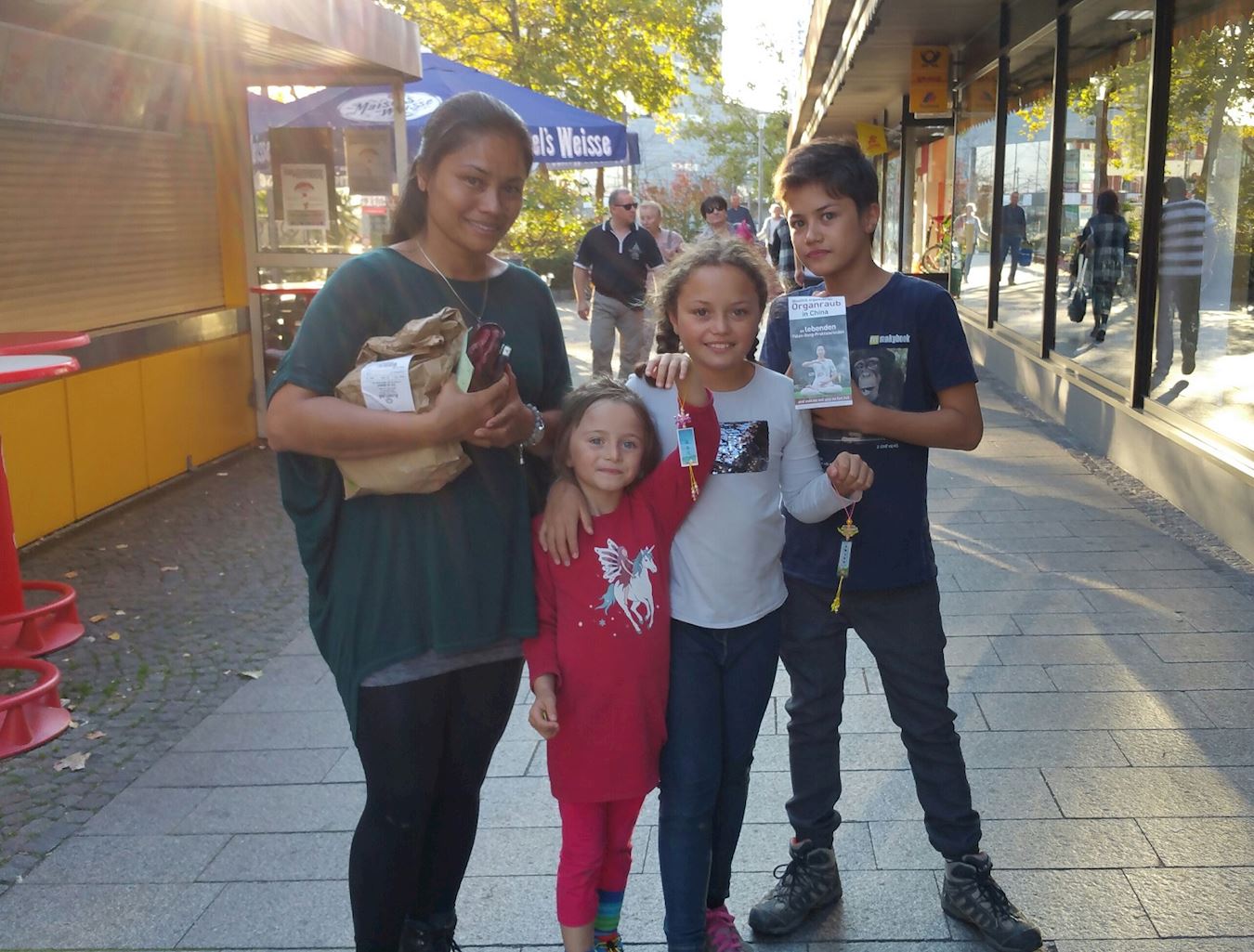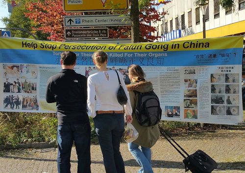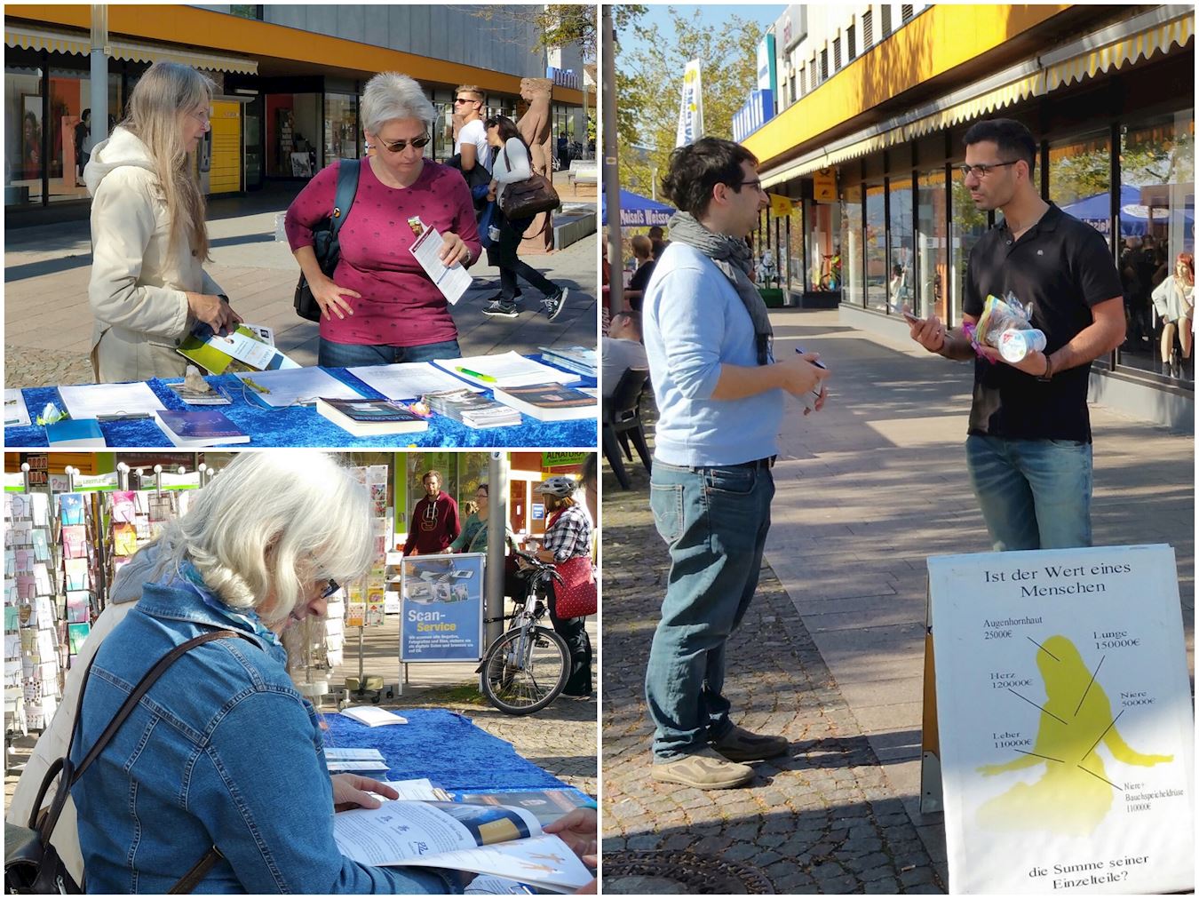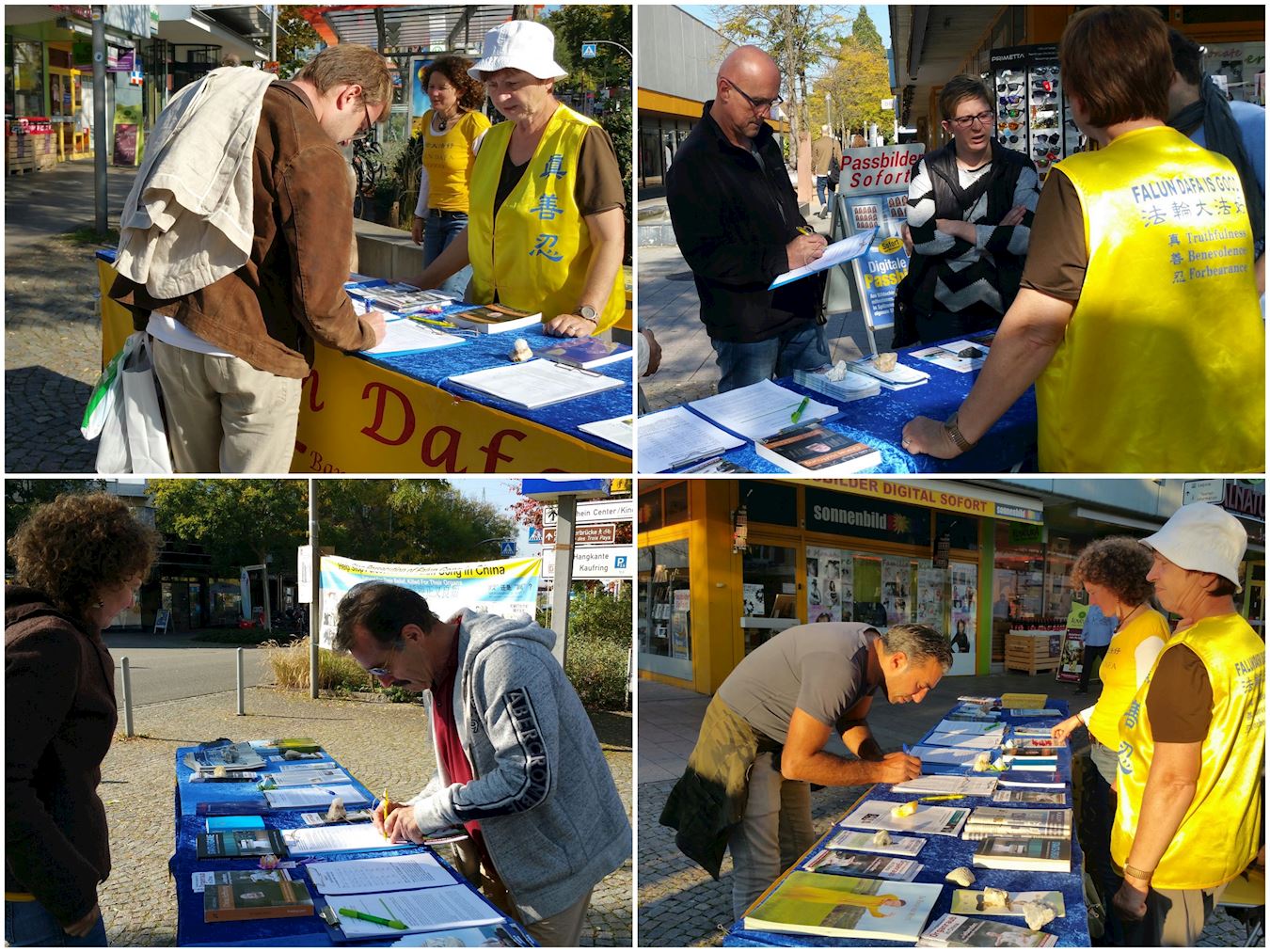 威尔市与瑞士、法国交界。周末,瑞法两国居民会涌入威尔市购物休闲,市政厅前的周末农贸市场和多家商店云集的“购物岛”上,三国居民川流不息。法轮功信息台设在了一家大百货商场门前,向来来往往的三国民众讲法轮功真相,传播法轮功的美好,并揭露中共对法轮功学员长达十八年的迫害,甚至活摘法轮功学员器官的罪行。