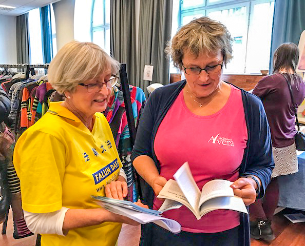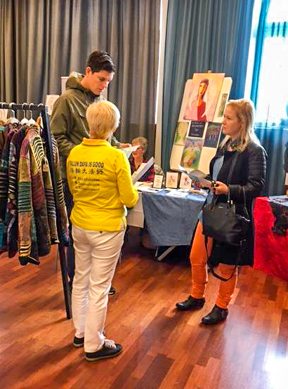 法轮功学员的展位也吸引了很多在寻找精神境界的参观者们。有一位女士来到展位前,就站在那里不想走了,她先买了一本供初学者入门的瑞典文《法轮功》一书,并告诉一位法轮功学员说,她半个多月前在另一座城市的健康展览会上见过法轮功,并学了第一套功法,感觉非常好,这次又遇到法轮功,而且还看到了上次教她功的那位女学员,她想向学员再多了解一下法轮功。