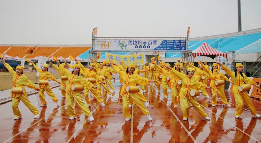 这是苗栗县马拉松活动首次有法轮大法腰鼓队参与,到场鸣枪起跑的苗栗县长徐耀昌特别与腰鼓队成员合影,并比出赞的手势高喊法轮大法赞。