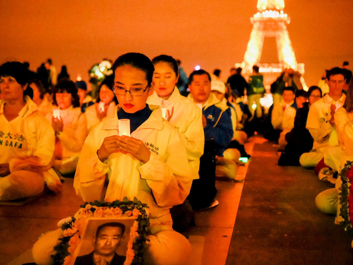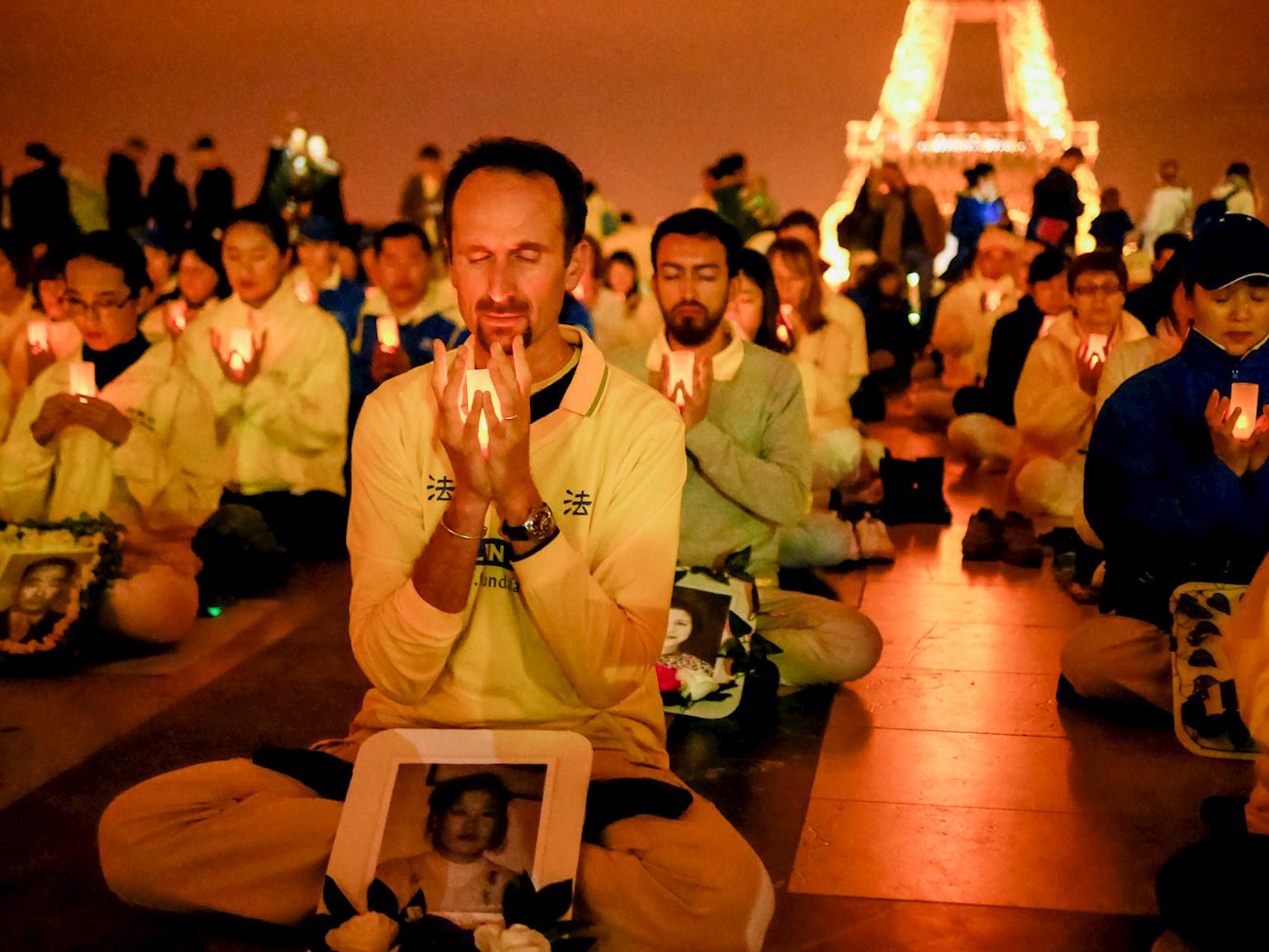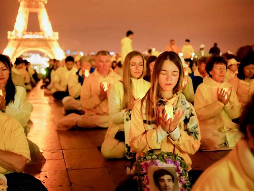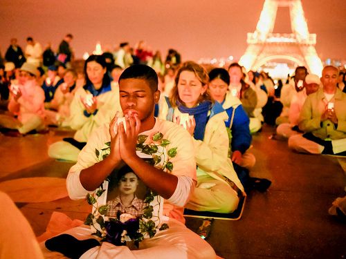 巴黎已进入初秋,当天晚上八点法轮功学员在人权广场依次坐下,每个人的面前燃起了烛光,点点烛光与铁塔上的灯光交相辉映,在人权广场形成了一道不一样的风景。烛光守夜吸引了许多游客,他们希望多了解法轮功和法轮功受迫害的情况。
