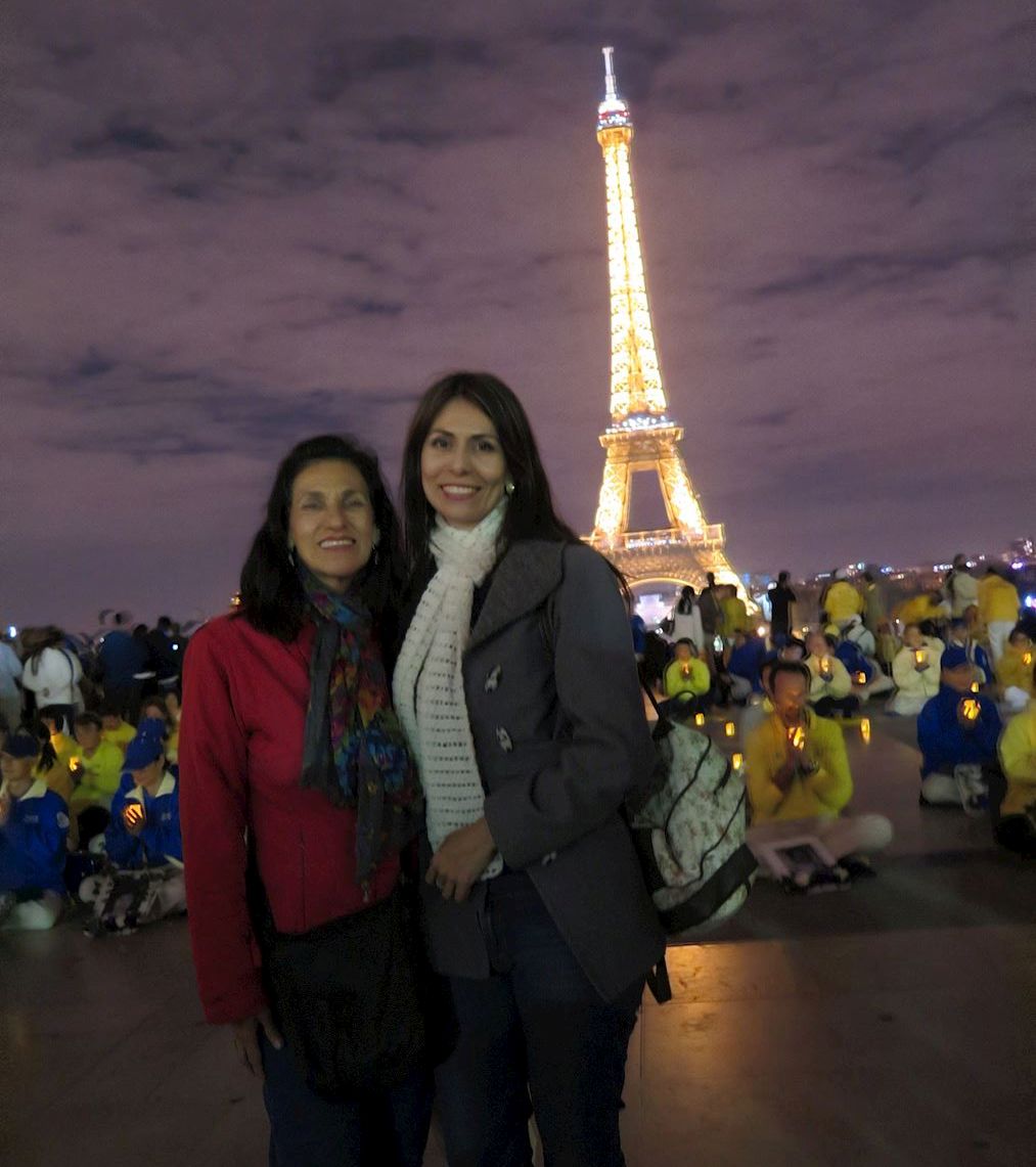 律师卡罗琳娜·苏珊(carolina suanez)和她的母亲从哥伦比亚到巴黎旅游,在回国前的晚上她们到埃菲尔铁塔看夜景。卡罗琳娜·苏珊对法轮功学员的烛光守夜尤为关注。她说:“这个场面很好,他们在为整个世界祈祷。”当她了解到法轮功学员因为修炼而被打、被抓、甚至被活摘器官,她的眼里涌出了泪水。