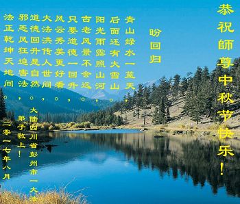 古人有云:滴水之恩当涌泉相报。在中秋佳节来临之际,我也翻个墙,恭祝李大师中秋快乐!我还没见过恩人,盼着您回来,我也修炼法轮大法,那时候也许没有中共贪官了,也没有雾霾了。
