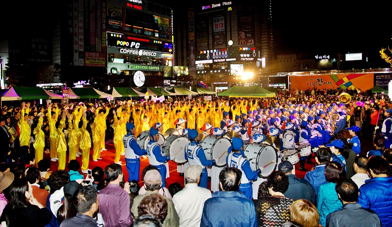 富川市有很多中国人,看到威武雄壮的天国乐团的演出,惊讶不已。加上身穿金黄色服装展现法轮功优美舒缓功法的演示队,很多人都惊喜地张大嘴巴目不转睛地看着,并不间断地鼓掌。