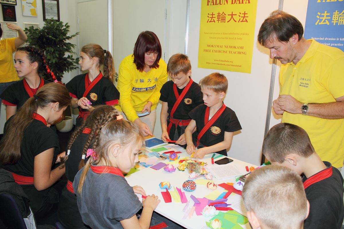 小朋友们则被纸莲花吸引,学习折叠纸莲花。来自白俄罗斯的小朋友们主动来到学员的展位学折叠纸莲花。他们非常喜欢学员讲述的关于莲花的故事。一位女孩表示,她因为身材矮,无法参加决赛,感到很紧张。她来到法轮功学员的展位后,祥和的音乐和法轮功学员的笑容驱散了她的紧张和焦躁。晚上他们要回家时,小女孩久久不愿离去,她说希望能再次见到学员。