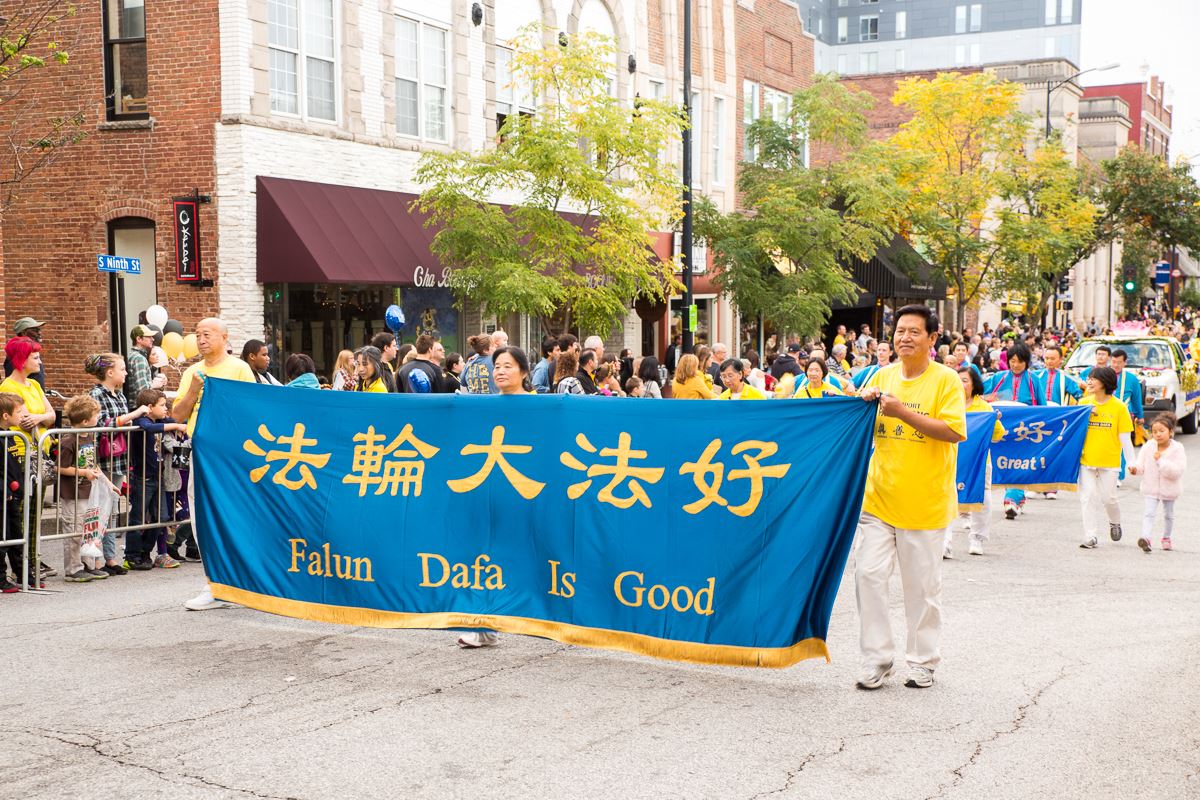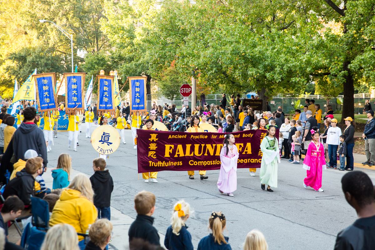 【明慧网二零一七年十月二十二日】2017年10月21日,法轮功学员参加了美国密苏里大学哥伦比亚分校一年一度的返校节游行。密苏里大学的返校节始于1911年,是全美最大的返校节庆祝活动之一。今年的游行有超过130个团体参加。预计有超过一万人从各地赶来参加返校节活动。
