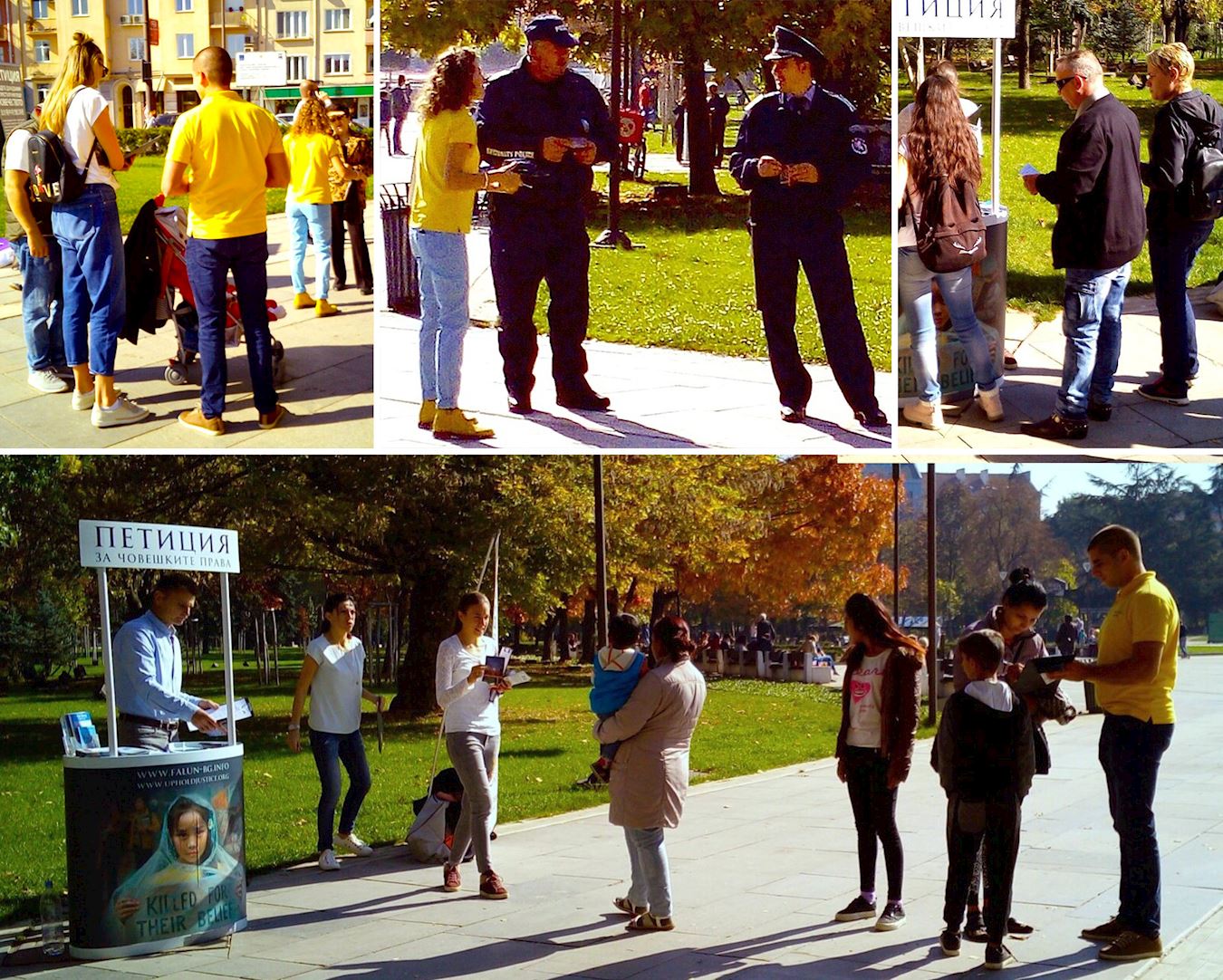 十月二十一日上午十一点,部份法轮功学员们在市中心保加利亚广场附近举办信息日,为过往民众讲述正在中国发生的对法轮功学员活摘器官的罪恶,并征集制止活摘,支持法轮功反迫害的签名。当刚把征签台摆好,来了五、六位执勤的警察,学员们给警察讲述十八年来,修炼真善忍的法轮功学员在中国被活摘器官,被迫害的真相时,其中一位警察说:“这是真的吗?这怎么可能?太可怕了!无法想象!如果这是真实的,我来签名反对活摘。”说着慎重地在征签板上签了名。其他听完真相的三位警察也跟着签名,表示这种反人类的活摘器官恶行一定要停止。