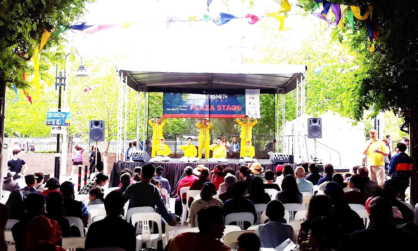 当天游行结束后,法轮功学员应邀在最大的庆典舞台上做功法演示。身着金黄色炼功服的学员们演示了法轮功的五套功法,西人法轮功学员在一旁为观众讲解每一套功法的特点及功理,并用自己亲身修炼经历告诉观众:修炼法轮大法令人身心受益;法轮功是一种古老的修炼方法,简单易学,并在全世界一百多个国家弘传。欢迎大家学炼法轮功,每天早上六至八点在伊斯特伍德公园(图书馆旁边)有免费教功。