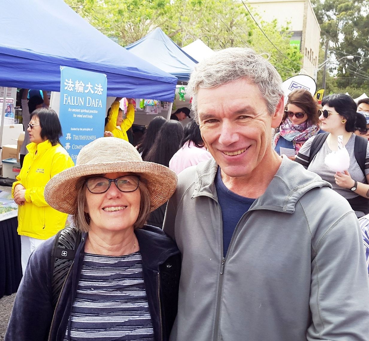 当地绿党候选人林赛·彼得斯(Lindsay Peters)和太太走过法轮功讲真相摊位时,高兴地和法轮功学员交谈。彼得斯先生在多次联邦和州选举中,一直是绿党候选人,他致力于支持社会和经济正义,与非暴力的原则。他曾经在竞选过程中去当地法轮功学员那儿倾听正在中国发生的迫害经历。