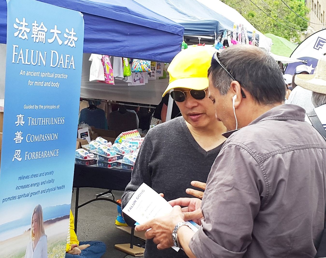 ![]() 图4:法轮功学员的展位吸引了很多民众前来了解功法 |