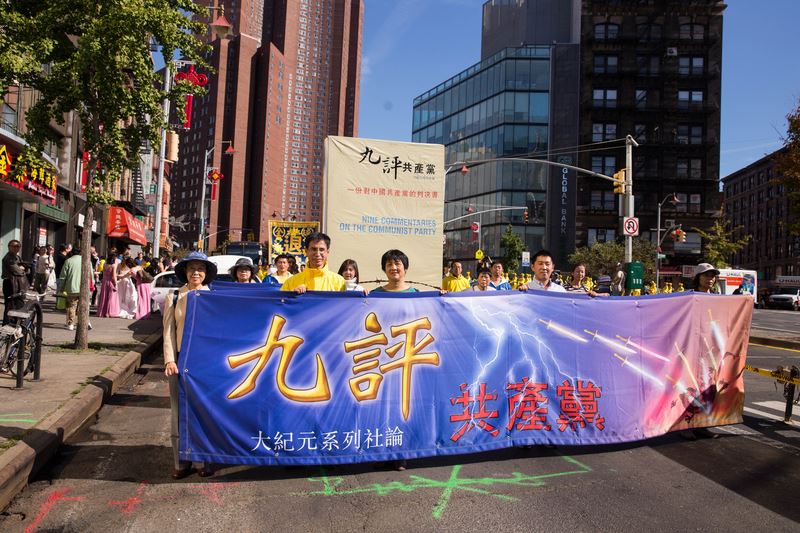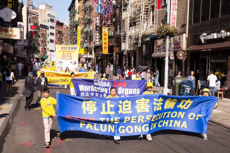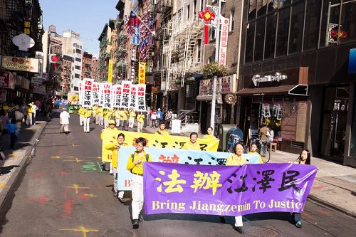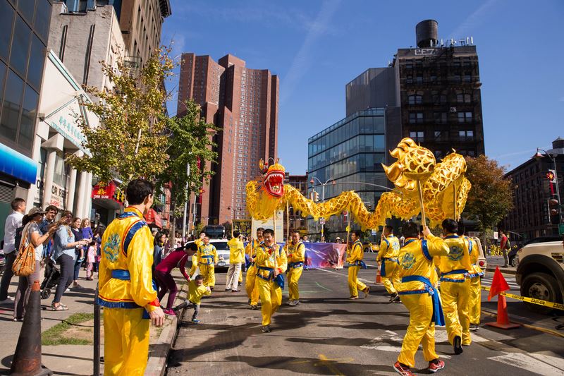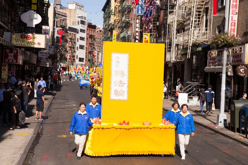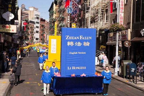 在纽约的晴空下,法轮功的队伍走过华埠的大街小巷,嘹亮的鼓乐声振奋精神,给民众带来美好的福音。