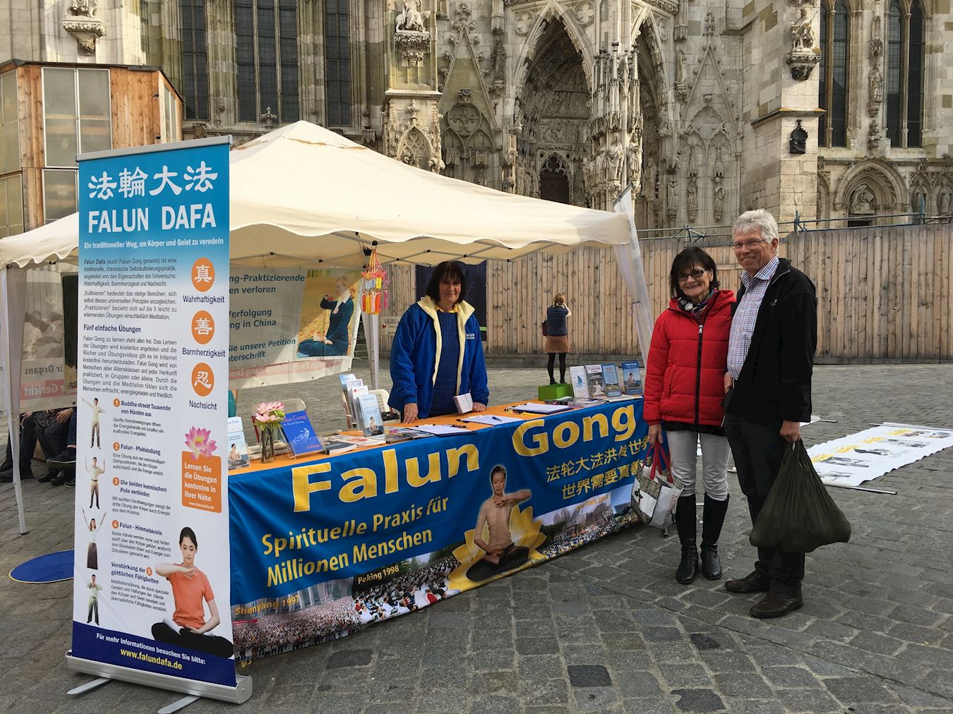 来自不来梅(Bremen)的Babel Stark和Bernt Stark夫妇,恰好在雷根斯堡度假。他们说四年前曾经去过中国,很为中国的美丽风景着迷,可惜现在知道了在中国还有这么惨无人道的迫害正在发生,这让他们感到非常难过。他们告诉学员,德国有句话:当天使出行的时候,天空也会笑。他们笑言,天气这么好,说明有天使在呢。他们祝愿法轮功学员们能征集更多签名,希望迫害尽快结束,因为如此正义的行动一定会有神助。