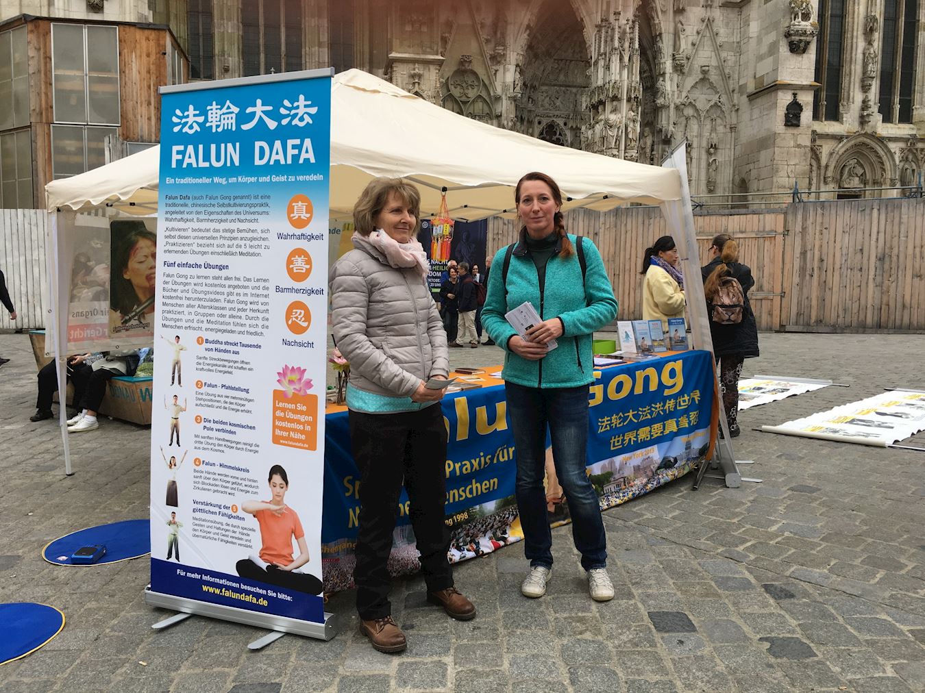 也有不少人是第一次听说法轮功,但马上表示很想学炼。在学校工作的Bettina Schinharl女士就是第一次了解法轮功,但看过资料后她表示很想学功,还跟学员约好了学功的时间。Renate Riedel和Wolfgang Riedel夫妇也是第一次听说法轮功,他们表示简直不能相信世界上有这种事情(指中共迫害法轮功学员)发生,Riedel女士说她自己就很喜欢打坐,她知道这很有帮助,因此她就更不能理解中共对修炼人的迫害。