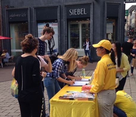 准备把海外法轮功学员们炼功的场面带回国的大陆游客,边拍摄边接过资料对学员说:“没想到在马斯特里赫特也能看到你们,我在科隆也遇见过你们,我在那里也接过资料。”