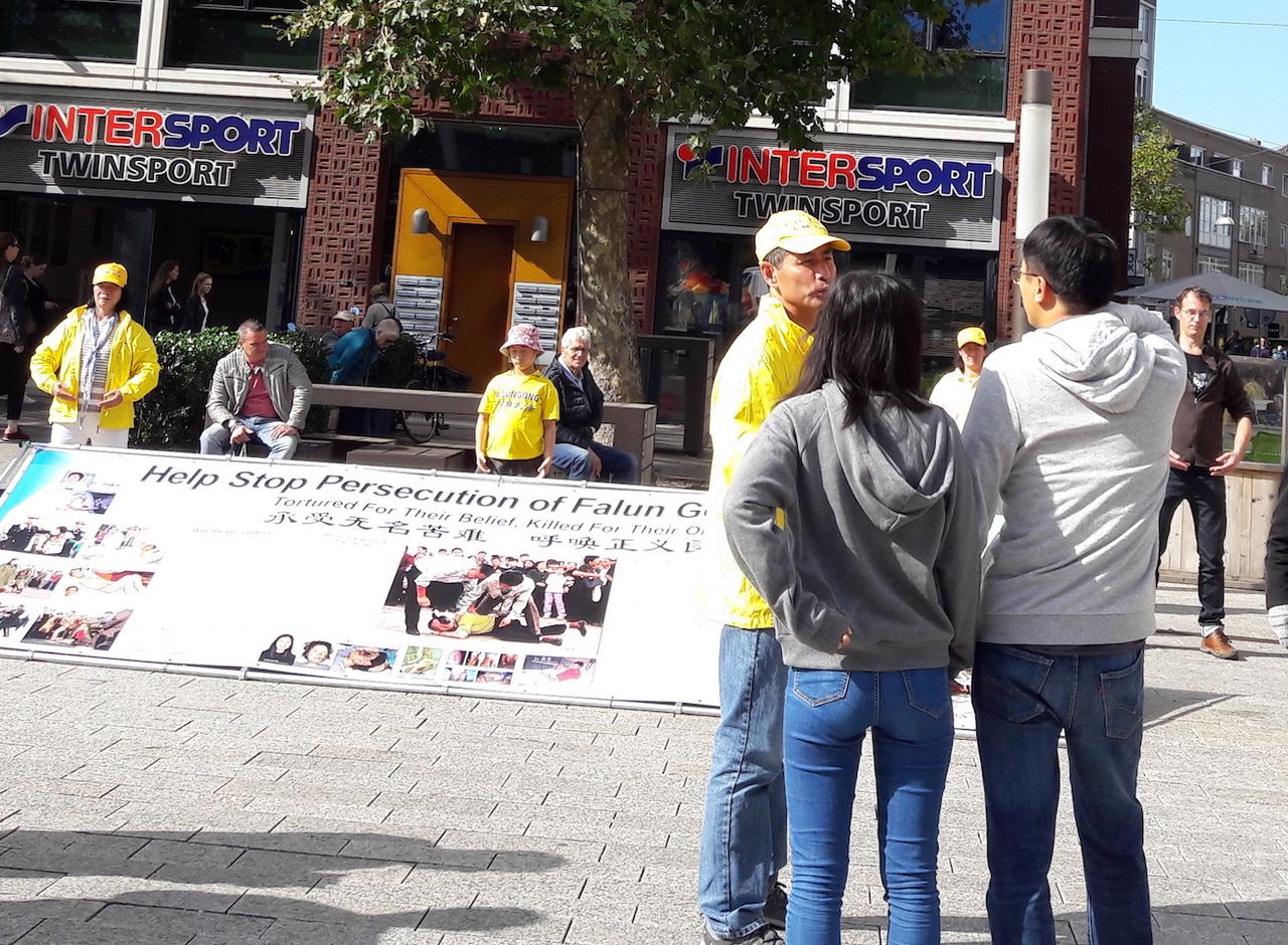 功法展示吸引了一些感兴趣的民众前来询问马斯特里赫特市的炼功点信息。一位女士聚精会神地阅读了展板上的内容,听了学员的讲解后,她问有没有法轮功教功班,因为她认识的一些人肯定会对这个(学法轮功)感兴趣的。居住在本市的学员与她交换了联系方式,做了教功的约定。