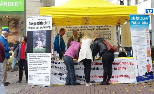 当天的天气可以用“金色十月”来形容,一整天市内行人如织,老远人们就可以看到黄色的横幅《法轮大法》,当人们听到法轮功学员宣读的真相之后,不少人前往展台,询问有关法轮功的真相,当他们了解到法轮功在中国被中共如此严重的迫害,纷纷签名制止中共的迫害,签名的人如此之多,有时不得不排队等候。