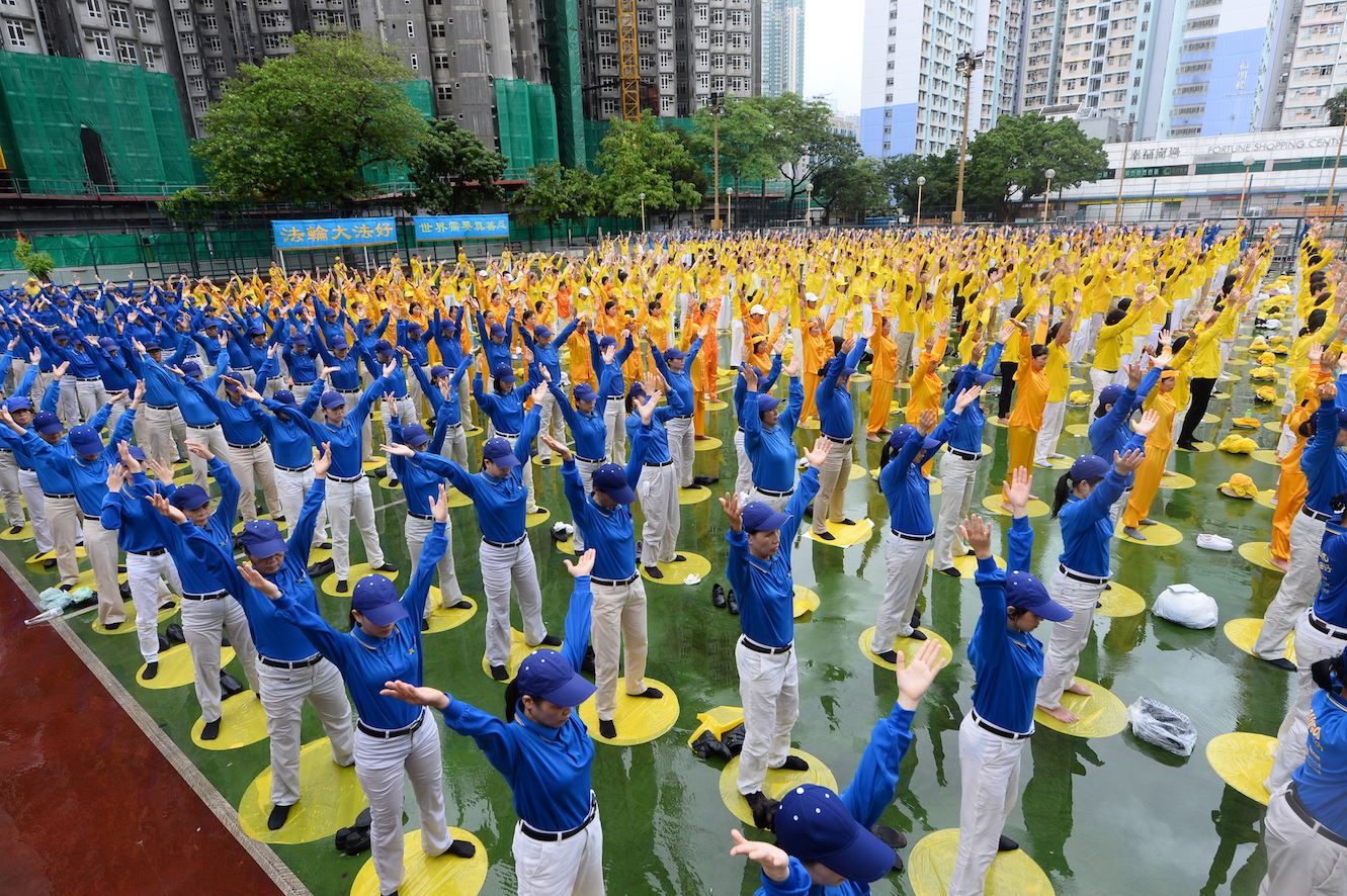 十一当日天气忽晴忽雨,仍无损活动的进行。约九百名香港及来自海外地区的法轮功学员上午先在长沙湾游乐场举行集体炼功,他们身穿黄色上衣,在悠扬的炼功音乐下整齐地演炼法轮功五套功法。中午举行集会后,旋即整队于下午二时,在天国乐团的引领下,由长沙湾游乐场出发,途经九龙闹市,一路游行至尖沙咀天星码头。