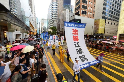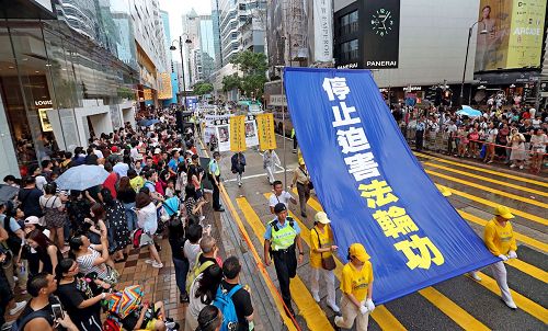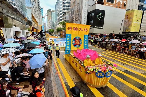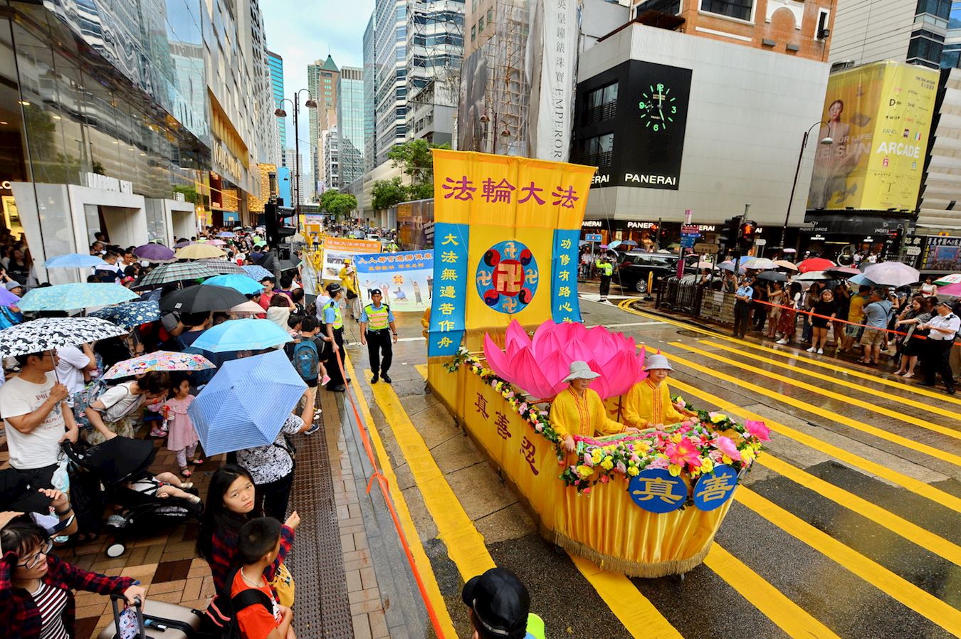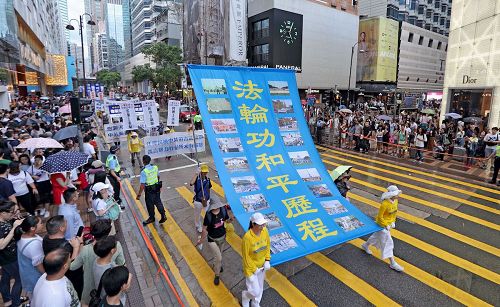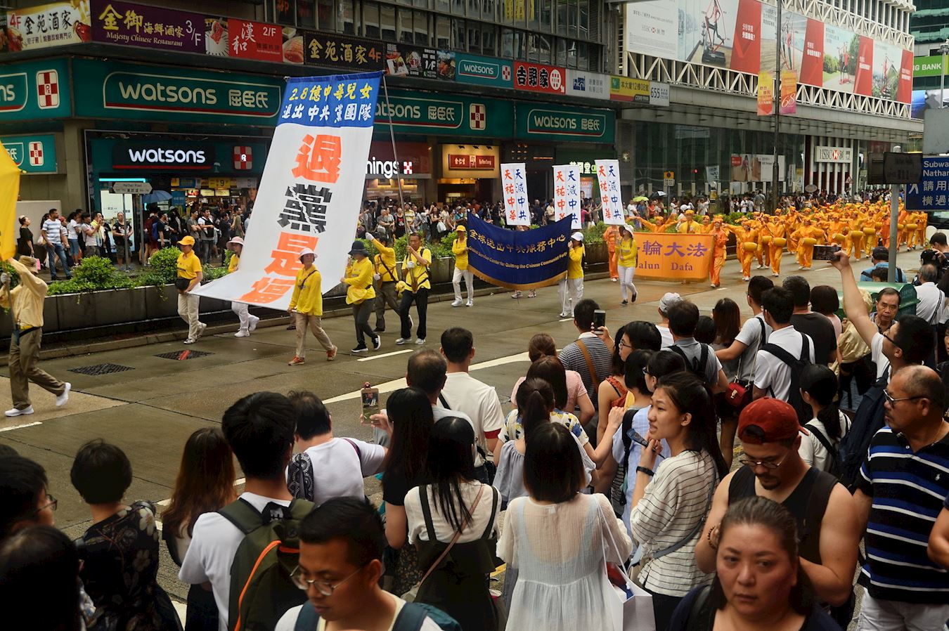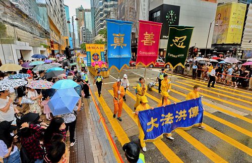 法轮功学员游行阵列中的大型横幅及各式幡旗,将法轮功真善忍的美好,及中共迫害法轮功学员真相传递给沿途的市民及游客。许多大陆的旅客深受震撼,纷纷拿起手机拍照和录像,他们表示法轮功“真、善、忍”教人向善没有错,会把游行的场面和信息传播给中国大陆的亲朋好友。