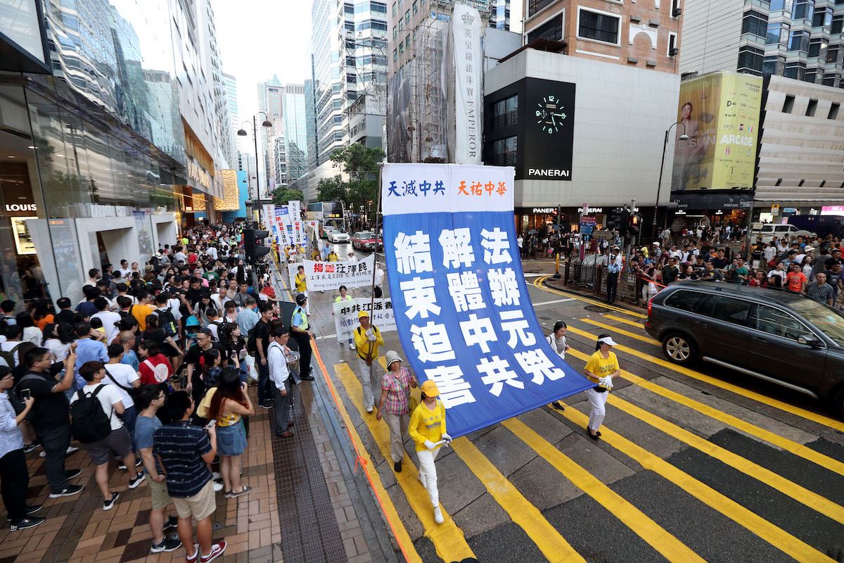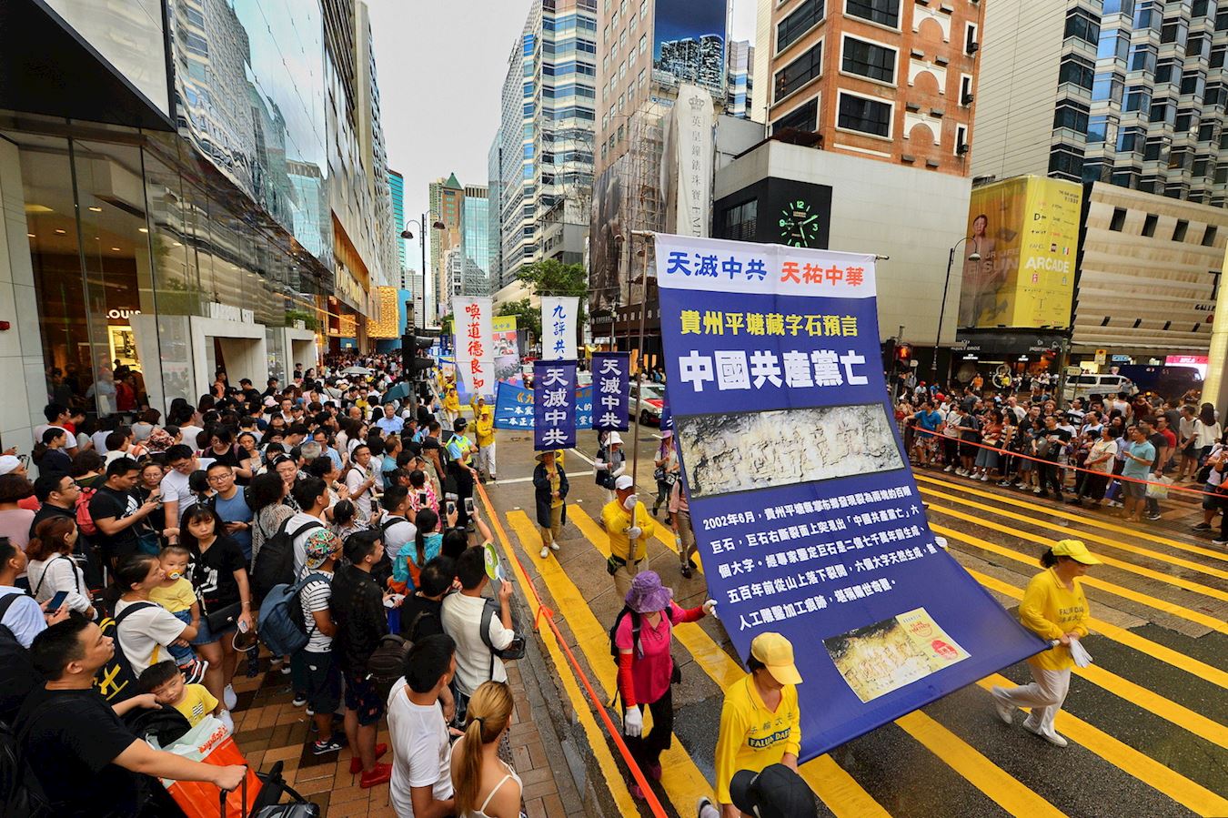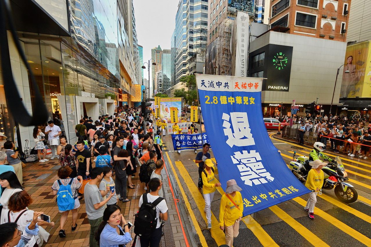 法轮功学员游行阵列中的大型横幅及各式幡旗,将法轮功真善忍的美好,及中共迫害法轮功学员真相传递给沿途的市民及游客。许多大陆的旅客深受震撼,纷纷拿起手机拍照和录像,他们表示法轮功“真、善、忍”教人向善没有错,会把游行的场面和信息传播给中国大陆的亲朋好友。