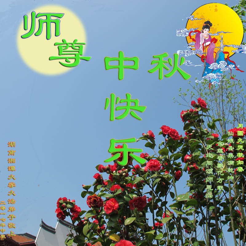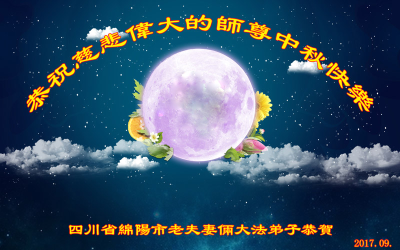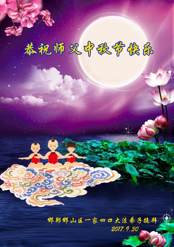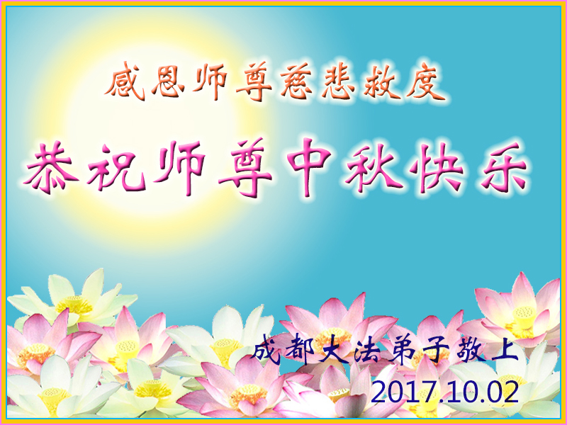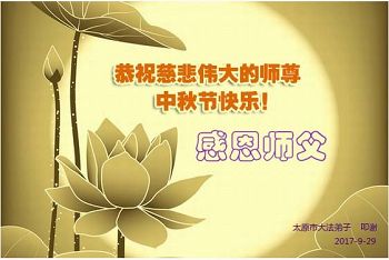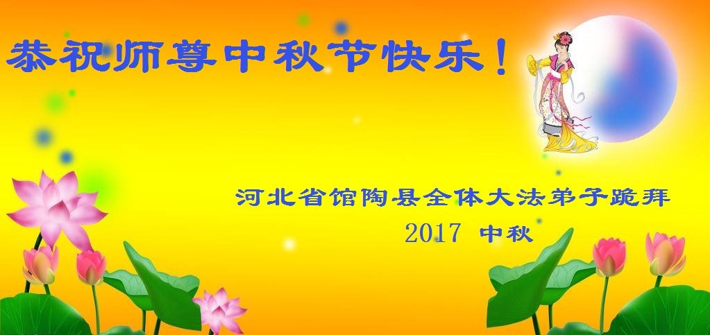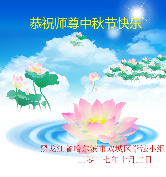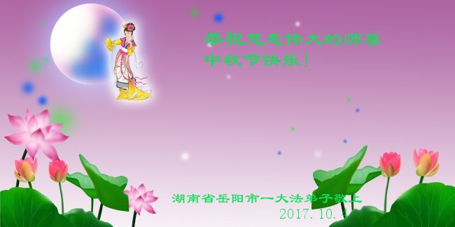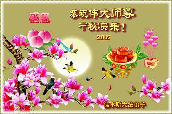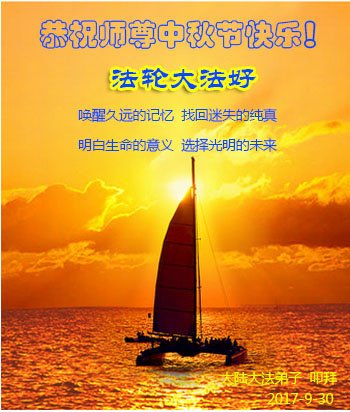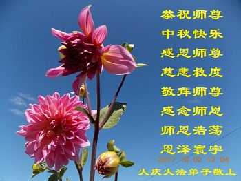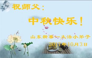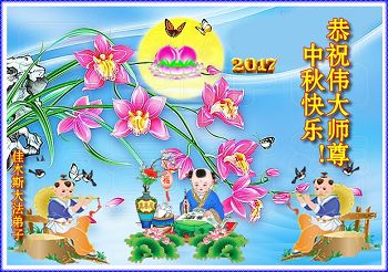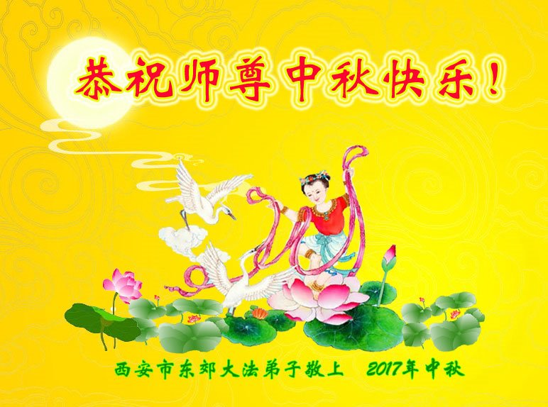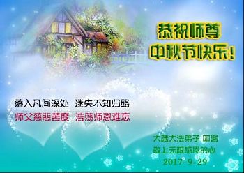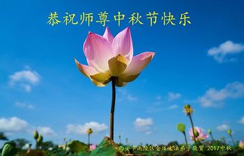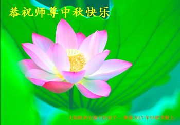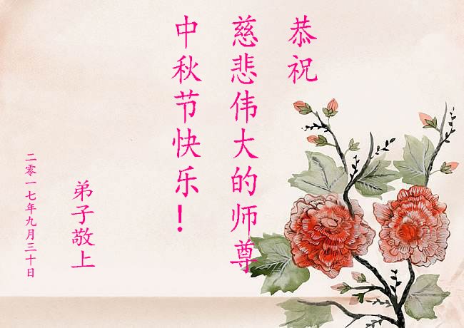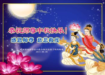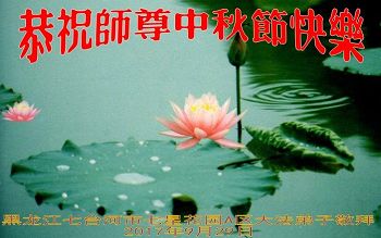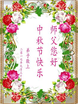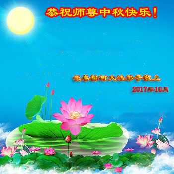 在二零一七年传统中秋喜庆佳节来临之际,弟子深怀无限感恩的心情叩拜师父,感恩师父的慈悲苦度,感恩师父对众苍生的慈悲救度,恭祝师父中秋好。在师父正法最后时间里,弟子一定用心学好法,向内修,修好自己,用心做好三件事,用心救人,兑现誓约,绝不辜负师父的慈悲苦度,跟师父回家。
