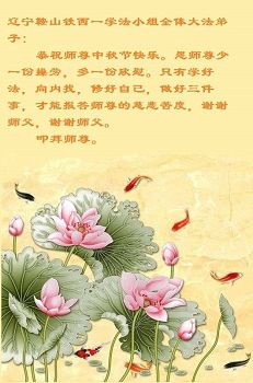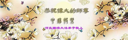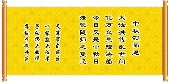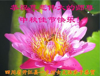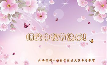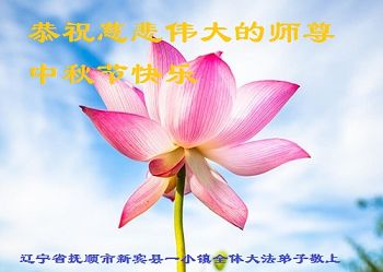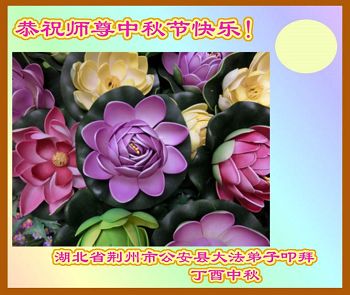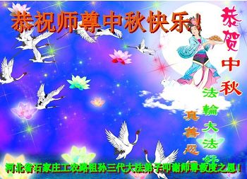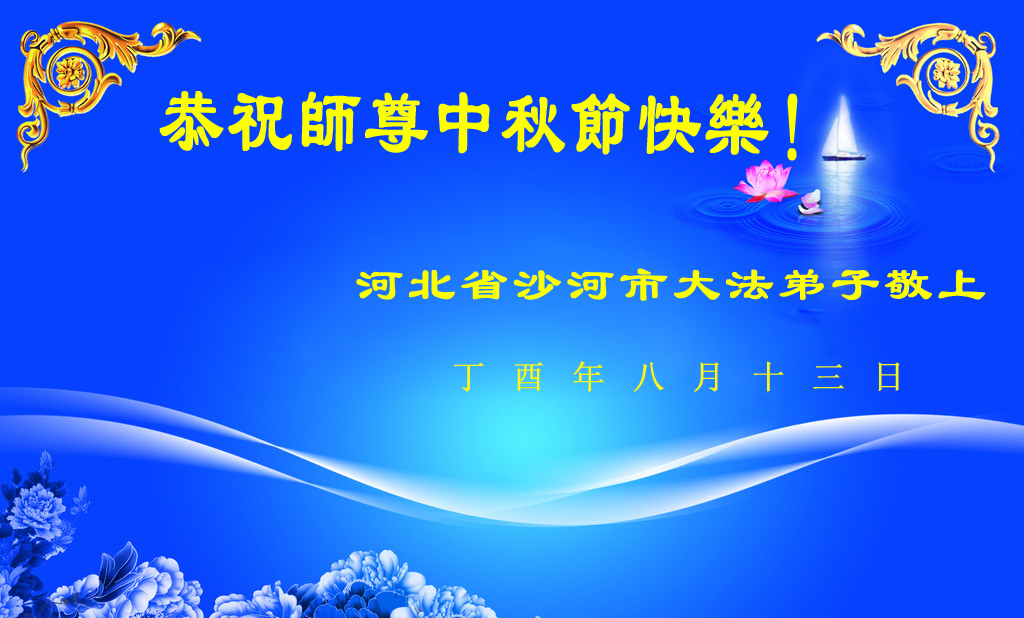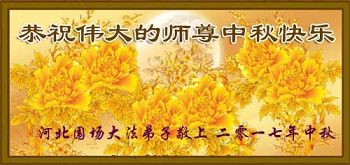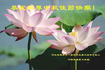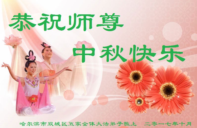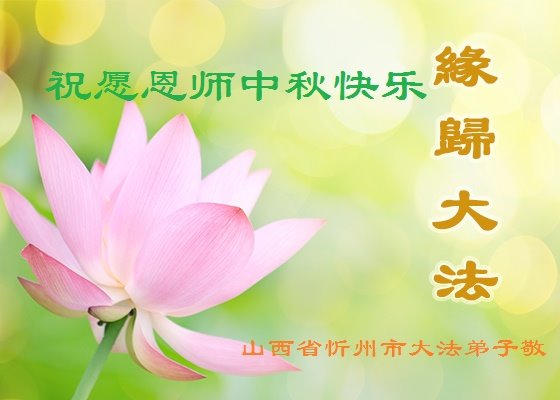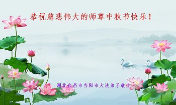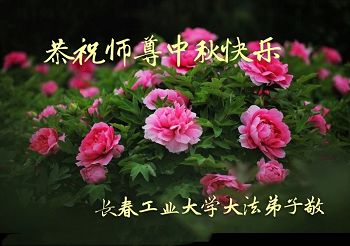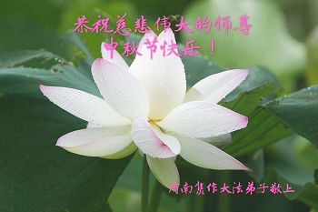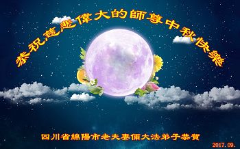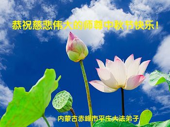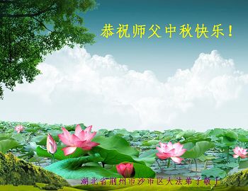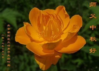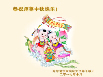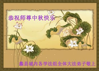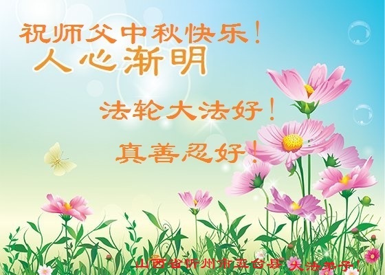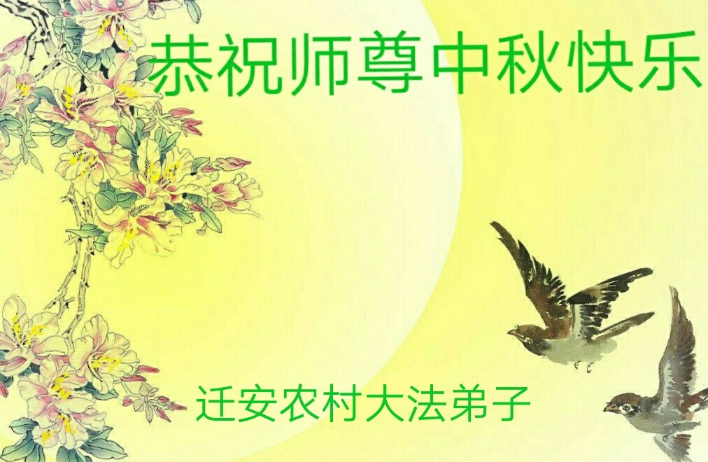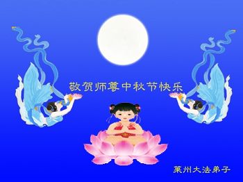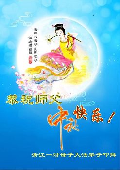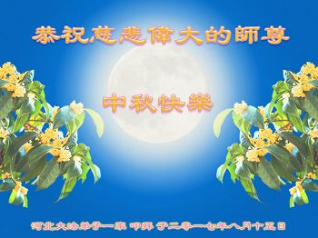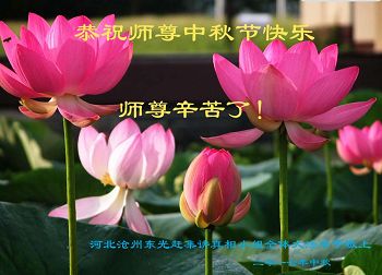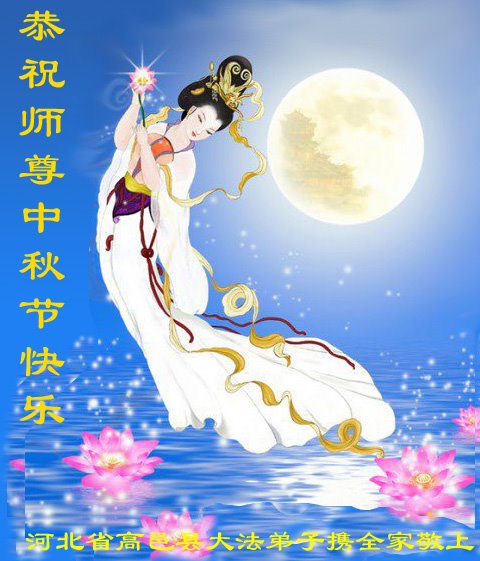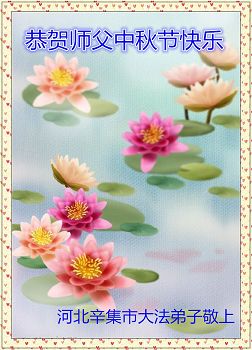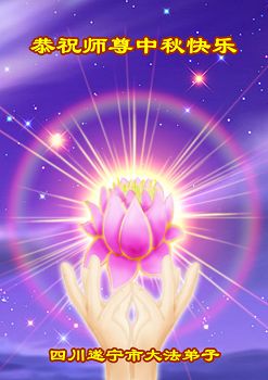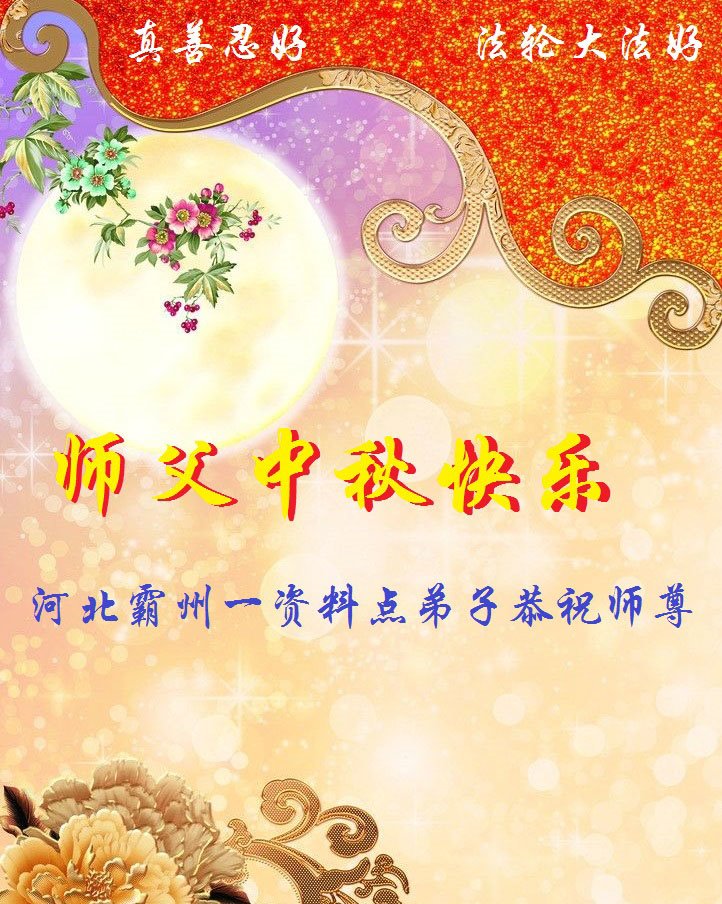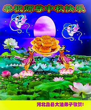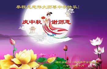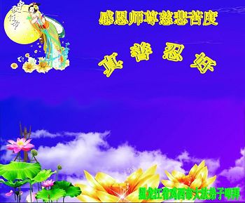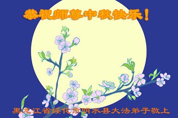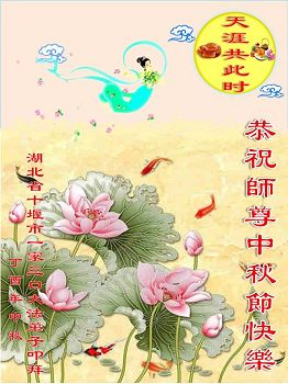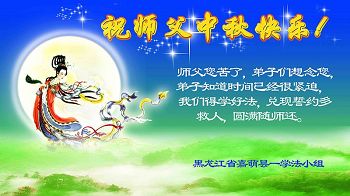 九月份,我从平房上掉下来之时,脑子里闪过九个大字“法轮大法好,真善忍好”瞬间安然无恙,我知道是您在我危难之时救了我,给了我第二次生命,使我又有了平静的生活,我无法报答您的救命之恩,只好借中秋节来临之际,祝慈悲伟大的李洪志大师中秋节快乐,谢谢您给了我这一切。“法轮大法好!真、善、忍好!”