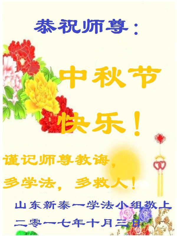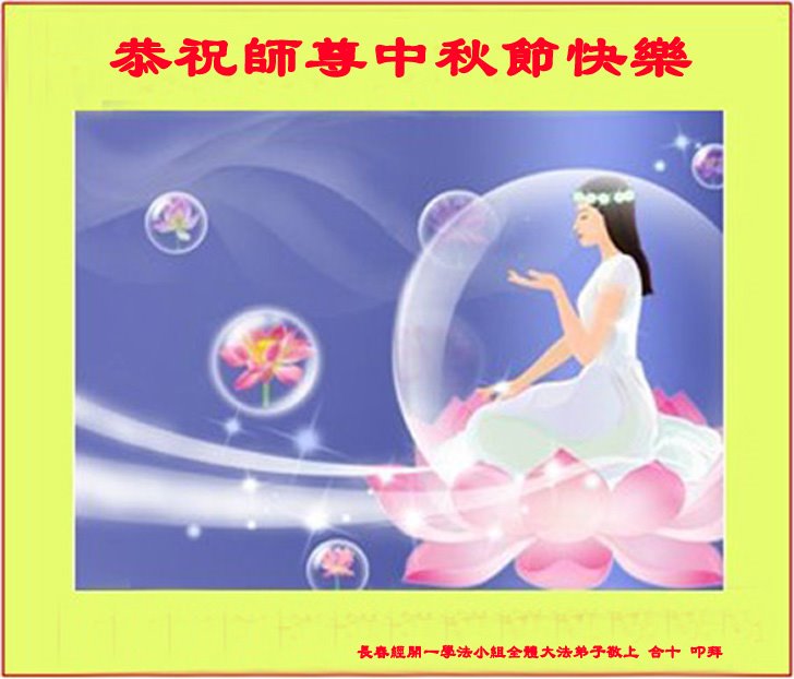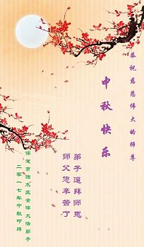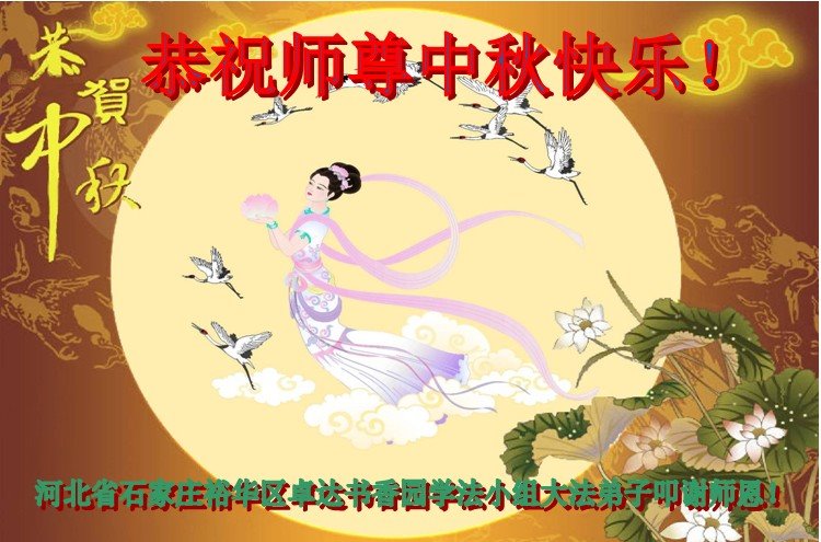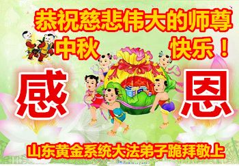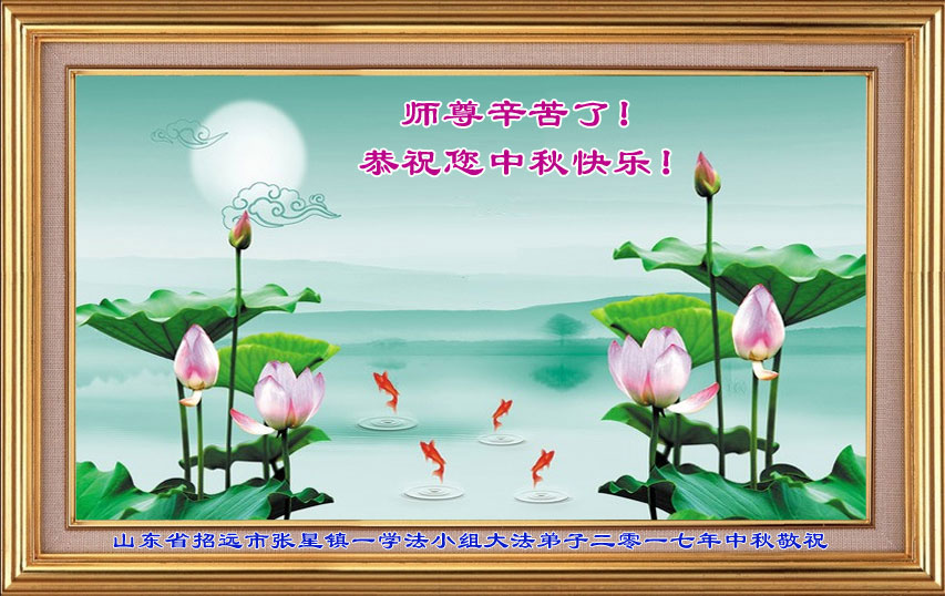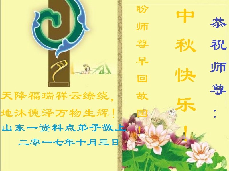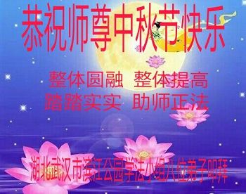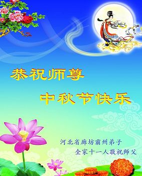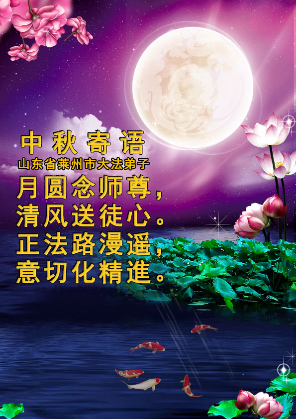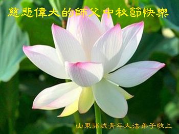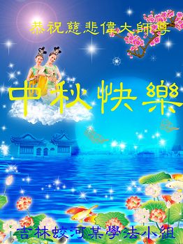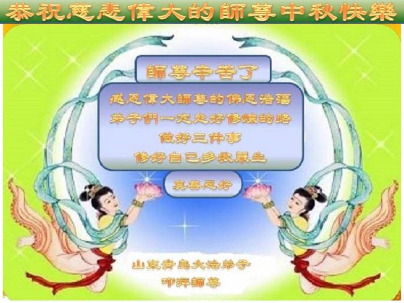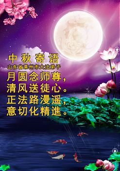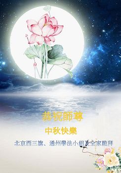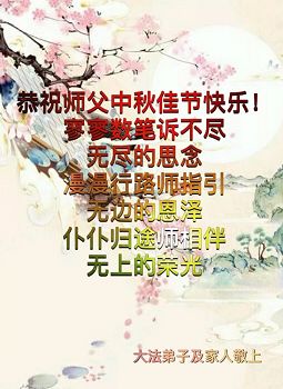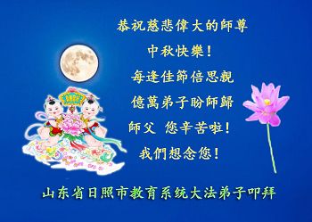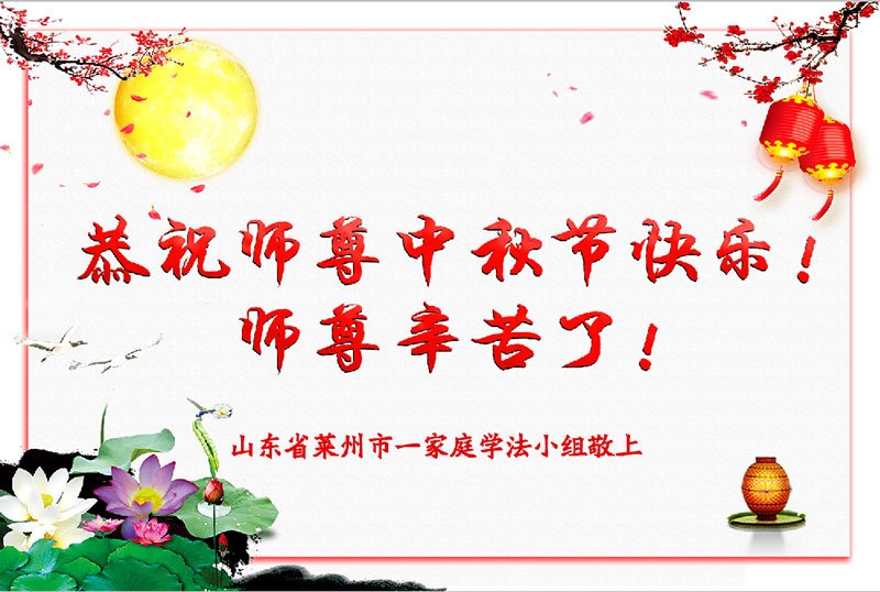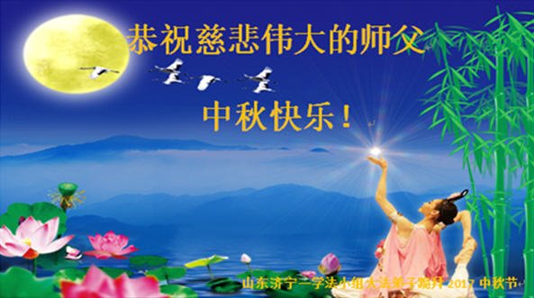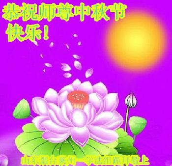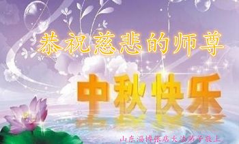 山东省省政府机关大法弟子在中秋节即将来临之际,向慈悲伟大的师尊致以最崇高的敬意和问候。祝师父中秋节快乐!弟子非常想念你,我们将一如既往的在助师世间行的道路上做好三件事,以完成好自己的历史使命,救度众生,再一次的感谢和叩拜师父的慈悲苦度。祝师父中秋节快乐!