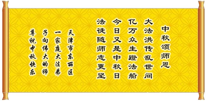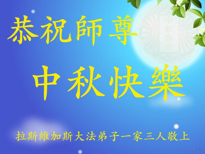 师父您好,我的父母都是大法弟子,所以我明白大法真相,也坚信法轮大法好,感恩师父在冥冥之中帮助世人及我的家庭化解魔难,及带给我们家的福份,谢谢师父在这个道德日益下滑的社会传这神奇的大法,您是众生的希望,我会永远默念法轮大法好,真善忍好,祝师父中秋节快乐!