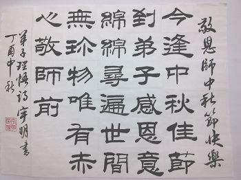 在这阖家团聚欢度良辰之时,弟子怀着最最崇敬的心情遥拜师尊,恭祝师尊中秋快乐!
