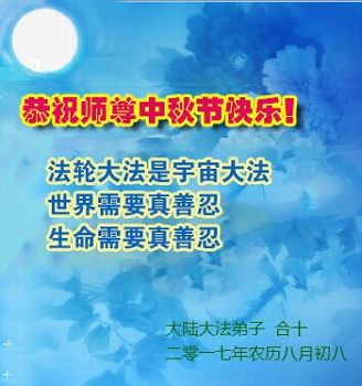 法轮大法博大精深,各行各业都能修炼,其中不乏军人、公检司法、政府部门职业人员、公务员。2017年中秋节来临,来自中国大陆军队、警察、司法、政府部门的大法弟子们向慈悲伟大的师尊致以最崇高的敬意和问候!祝师父中秋节快乐!