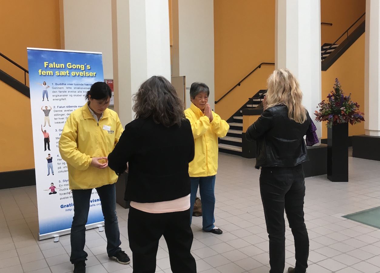 Mirelle女士按捺不住心中的激动,跟着法轮功学员学习五套功法。从第一套学到第五套全部学完,她还觉得没有尽兴,问法轮功学员能不能再继续打坐十分钟?那种得到珍宝,心中充满了喜悦和兴奋的心情自然流露。最后她请了《转法轮》,并留下了联系方式,要告诉在哥本哈根的朋友也来学法轮功。