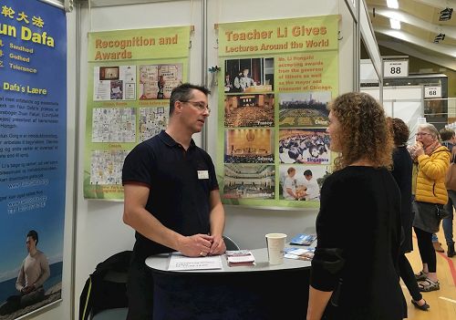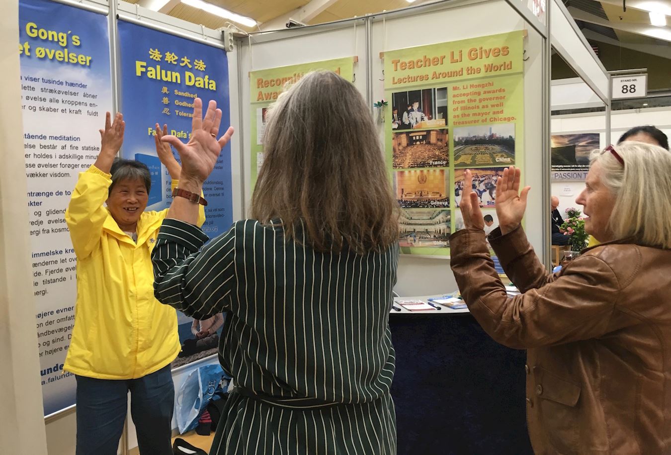 在博览会的法轮功介绍会上,学员介绍法轮功是佛家修炼功法,按照真善忍修心做好人,性命双修,达到思想净化,身体健康。在播放的录像中,中西方学员谈到自己的修炼体会和身体变化,对与会者很有启发。最后演讲的学员请大家站起来炼第二套法轮桩法。大家静静地抱轮,不少人感受到能量场。博览会后的第二天,参加介绍会的丹麦人Bodel打电话给学员说:“参加法轮功介绍会的感受太好了,我报名参加周末的炼功。”