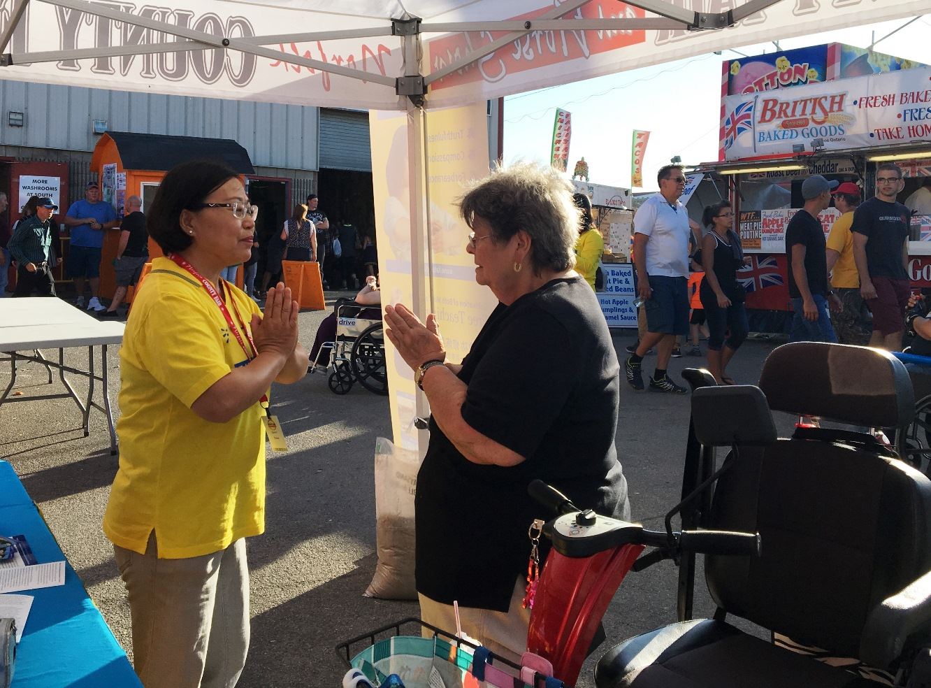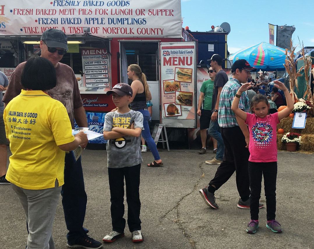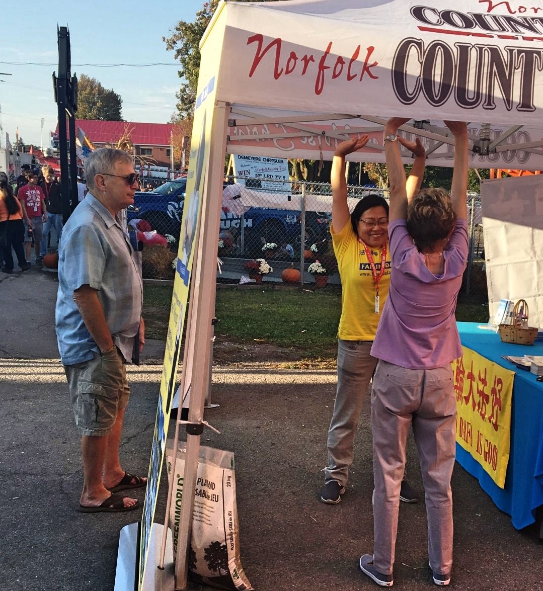 这是法轮功学员第一次参加诺福克博览会及赛马节弘法,布置漂亮的展位和优美平和的功法吸引了好多游客驻足观看。此展会是安省的第四大展会,也是省内百强节日活动之一,每年吸引超过十万人次的各年龄层游客。很多当地民众是第一次看到法轮大法,他们有的高兴地接过介绍法轮功的传单,有的倾听着法轮功学员的讲解,不少民众表示想学炼法轮功。