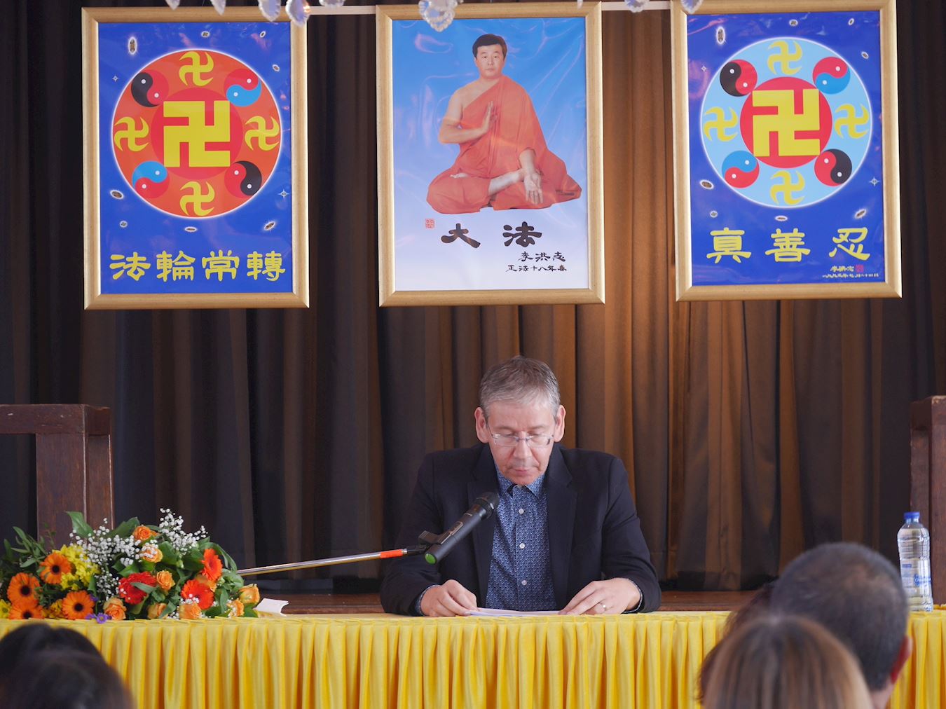 ![]() 九九年得法的西人学员皮特·赫本在发言中 |