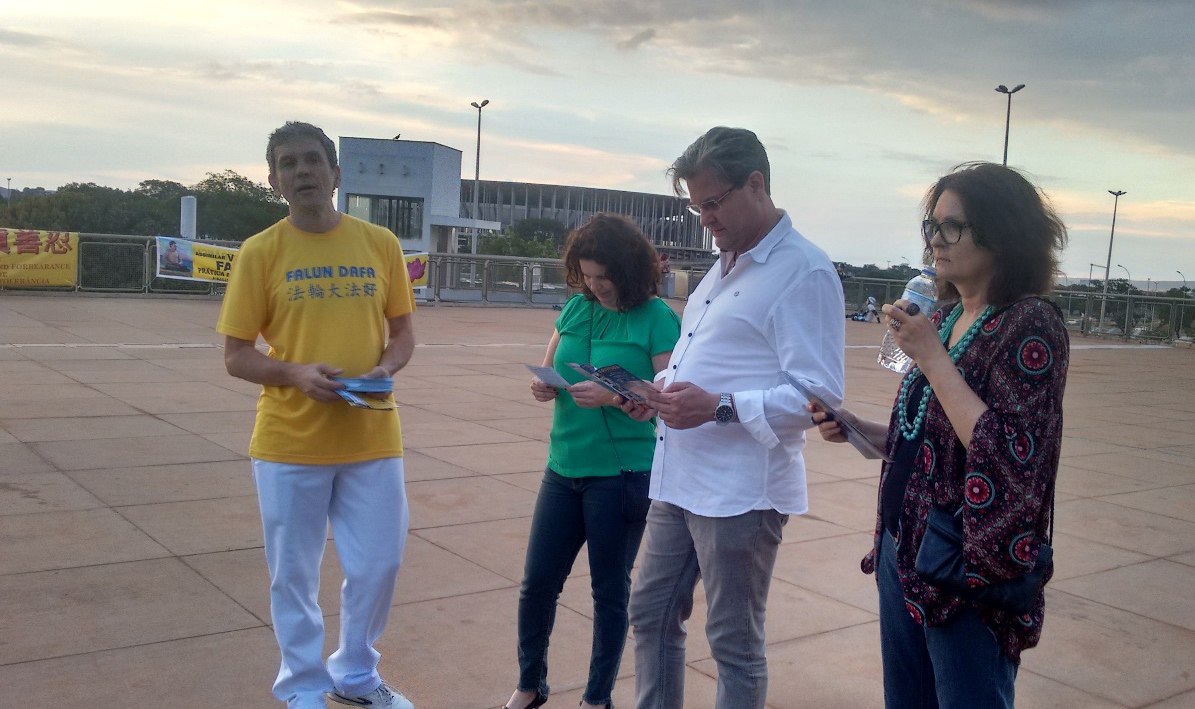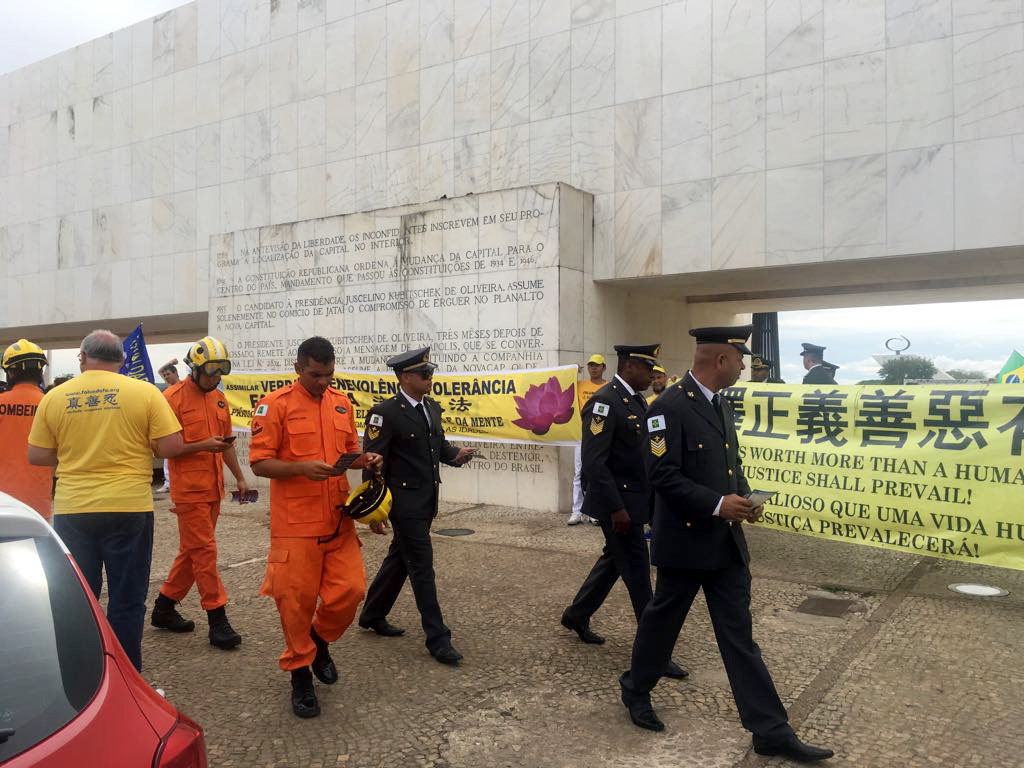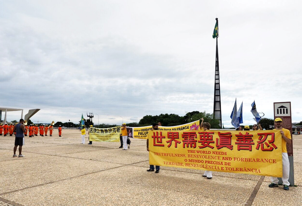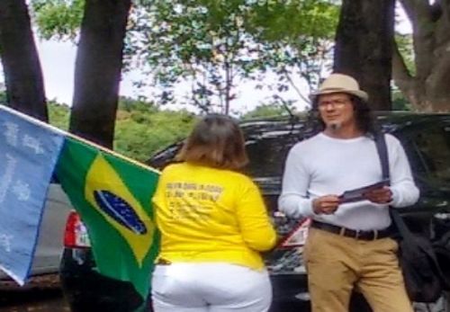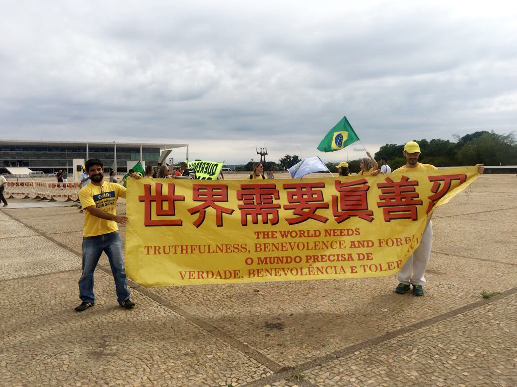 法轮大法是修身向善的高德大法,修炼者同化宇宙特性“真善忍”,要求自己做好人。但是中共却在中国迫害法轮大法修炼者,因此,在法会期间,巴西学员们来到中使馆前抗议中共的迫害,并要求停止迫害法轮功、惩办恶人、还法轮功清白。学员们平和的炼功、发真相资料、讲真相,来这里办事的人、路过的人、警察都了解了真相。