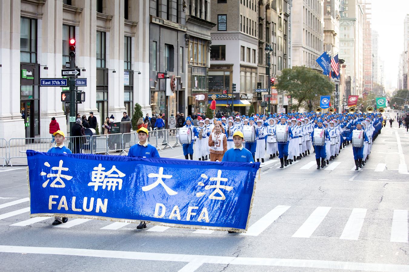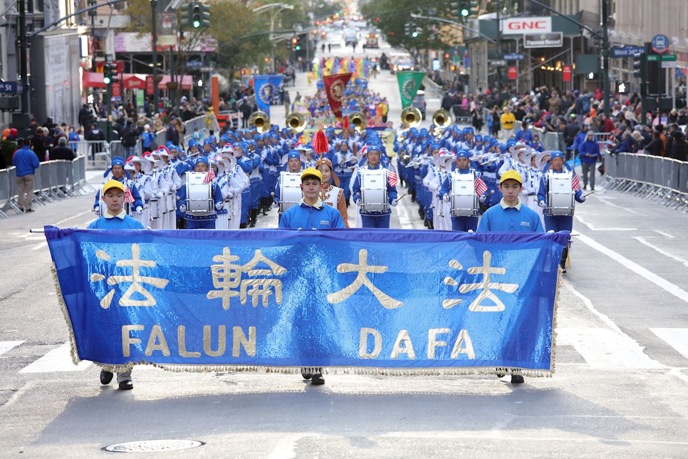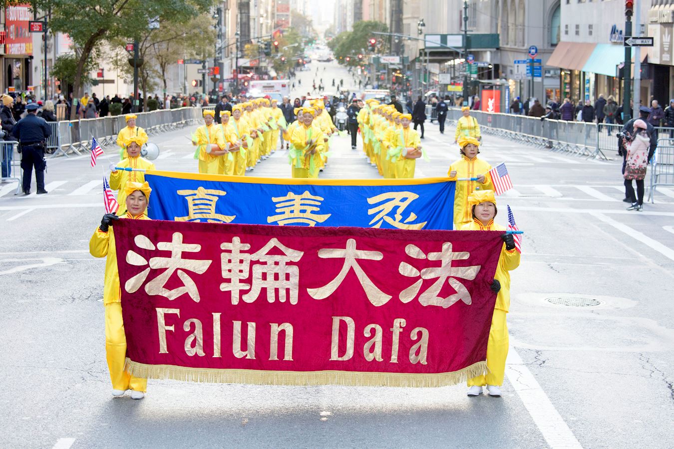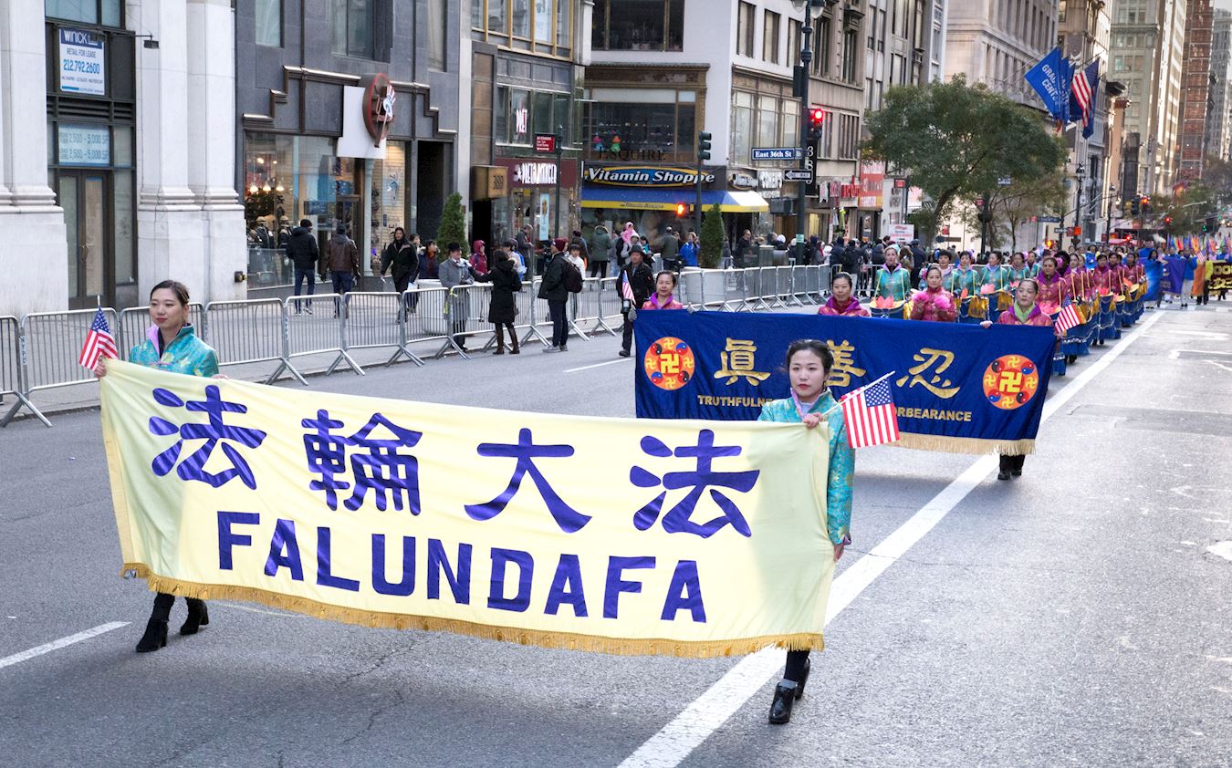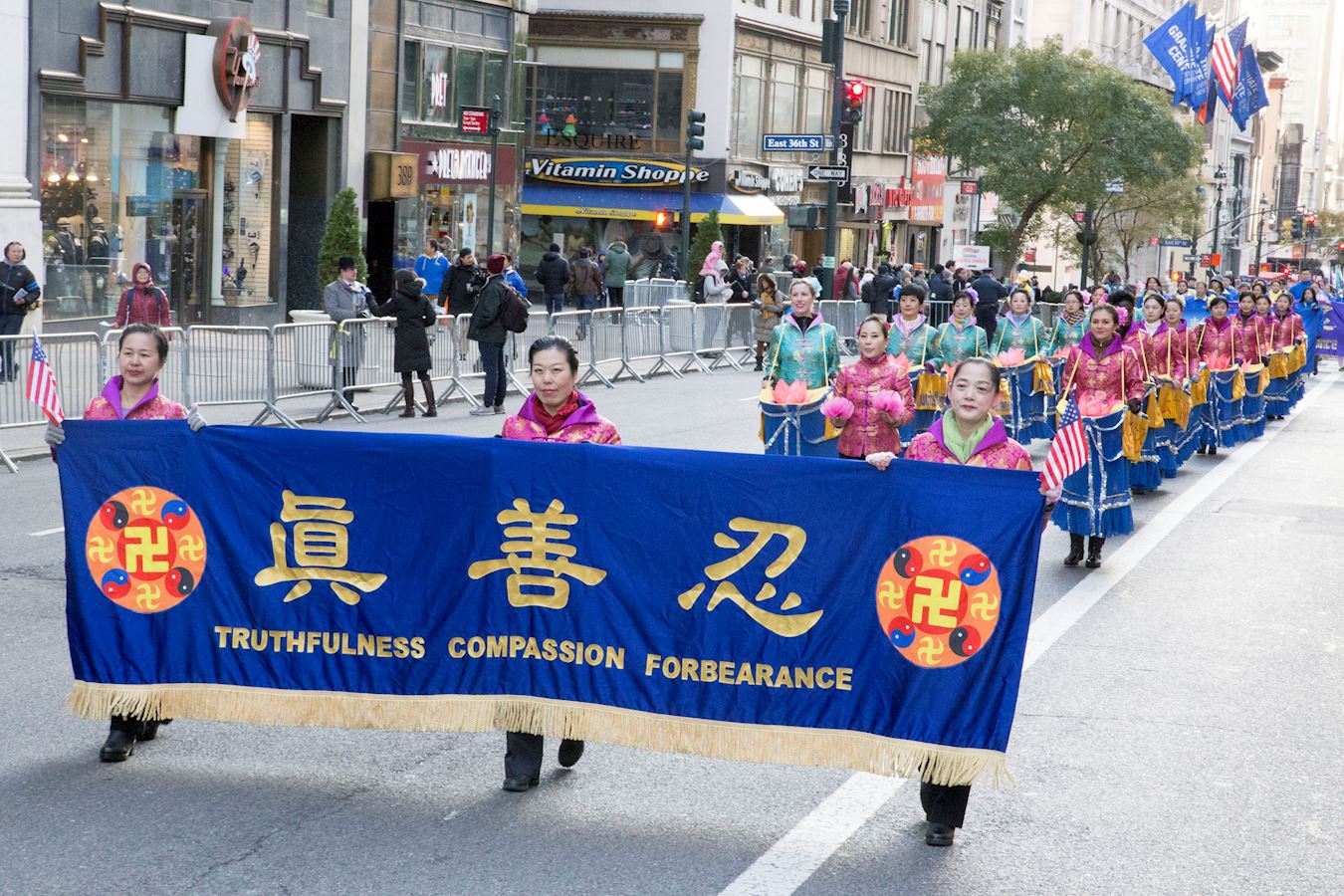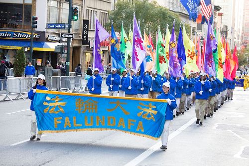 老兵节上,朝气蓬勃五彩缤纷的法轮功队伍把法轮大法的美好铺撒在初冬的曼哈顿街头,在冬日的寒冷中给民众送去“真-善-忍”的温暖。