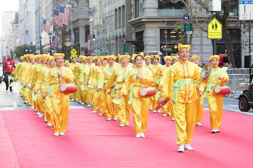 法轮大法队伍中,打头阵的是由一百六十多位法轮功学员组成的“天国乐团”军乐队。乐手们身穿蓝白相间的将士唐装,威风凛凛,他们演奏了象征自由精神的美国国家进行曲《星条旗永不落》,还有原创的《神圣的歌》、《凯旋》等曲目,大老远就可以听到他们嘹亮的乐声,相当吸睛。