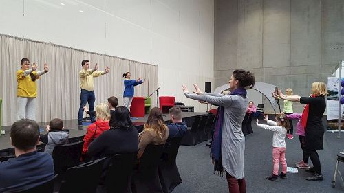 '图一~三:爱尔兰沃特福德健康展上,法轮功学员演示功法,游客学炼。'