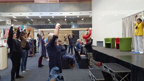 十月二十八日至三十日,展会三天适逢银行假期,许多游客是家人朋友结伴而来。现代社会的压力使很多人想寻求一种既能强身健体又能舒缓精神的方法,法轮功宁静祥和的功法吸引了许多人驻足。不少人在法轮功展位前阅读真相资料,或跟着法轮功学员一起学习功法动作。