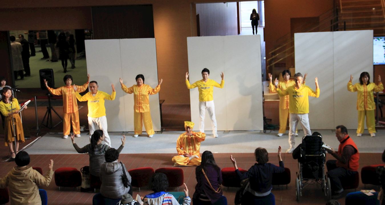 庆典期间,艺术文化大厅及公园一带广阔区域的室内外,摆满了传统手工制作、音乐、娱乐、健康、美食等各式展位,人来人往。当地法轮功学员参加了艺术大厅的舞台表演,向当地市民介绍了法轮功并演示五套功法动作,还表演了中国的传统腰鼓舞。