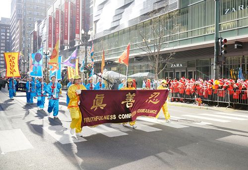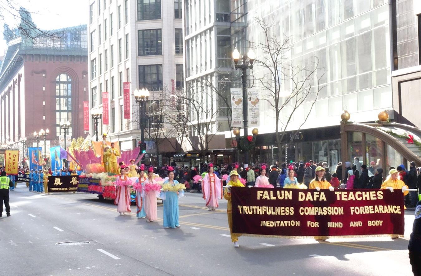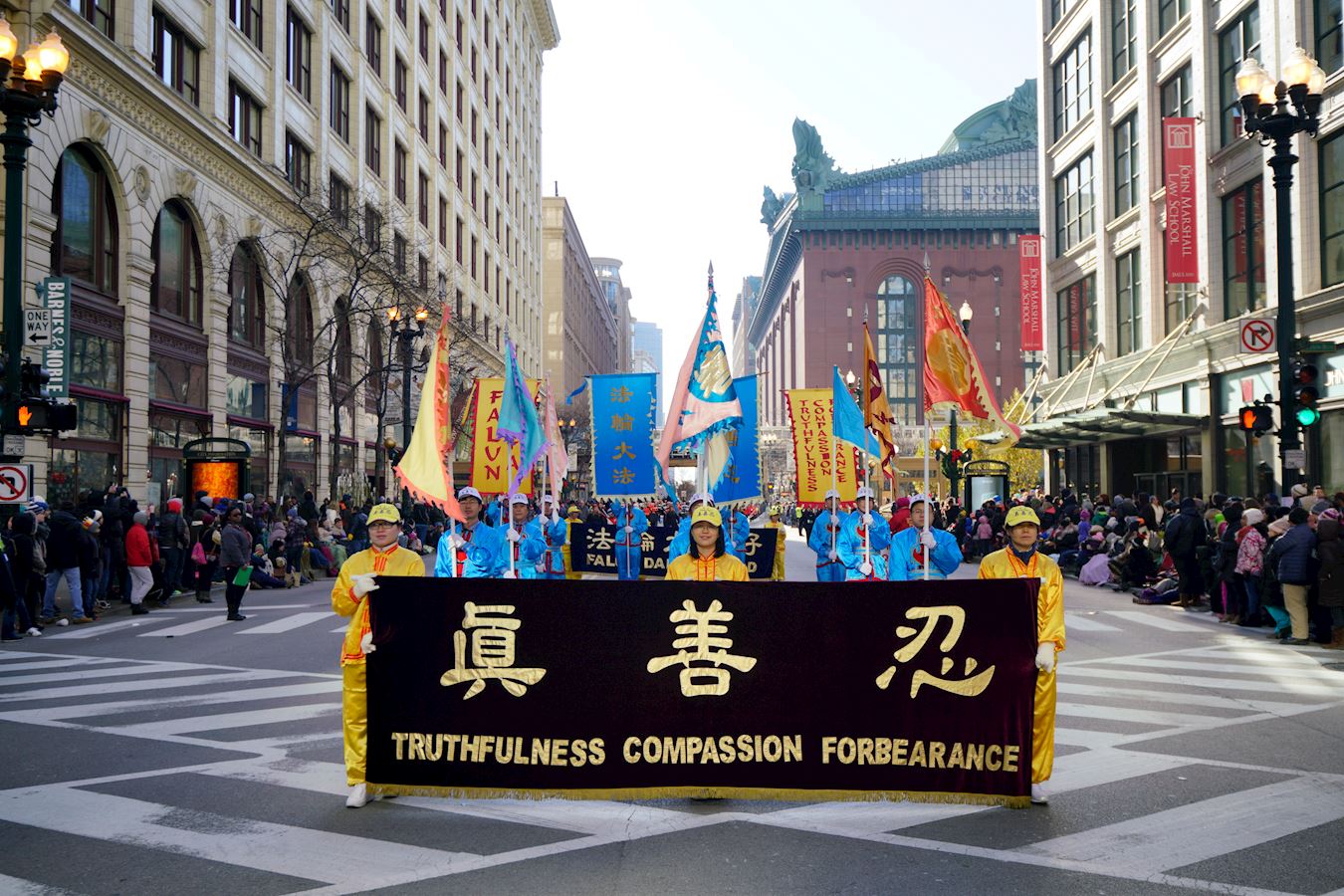 法轮功学员队伍首先打出的是“法轮大法”和“真善忍”英文横幅,随后是年轻女学员们手持莲花,面带微笑,洋溢着修炼人的乐观与朝气,紧接着是备受瞩目的大莲花花车,造型精美的花车上由小弟子和西人学员展示法轮功功法,纯净祥和。“普度”、“济世”音乐在政府大道上空飘扬。今年芝加哥学员又精心制作了多面“真”“善”“忍”彩旗,组成旗阵,带给芝加哥感恩节游行的老观众们一个惊喜。丰富多彩的阵容引来人们由衷地叹:“太美了!”